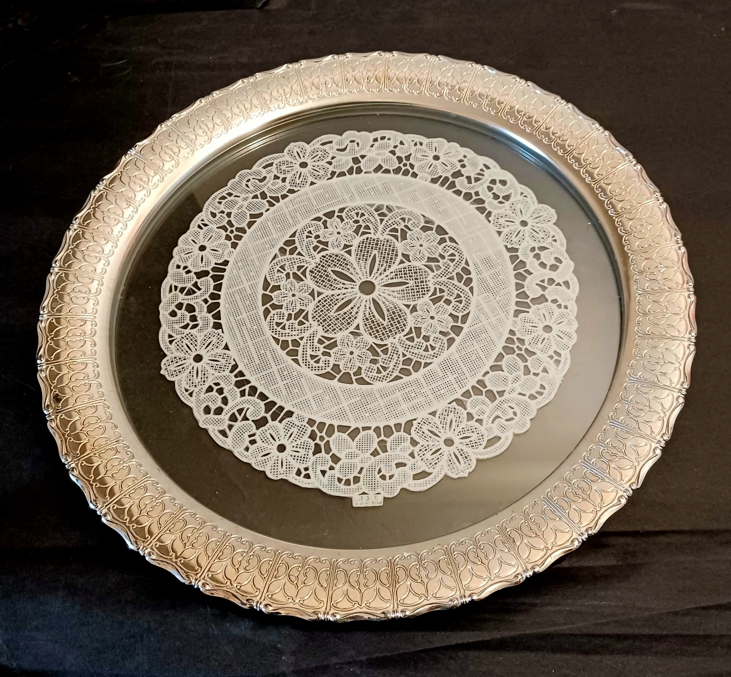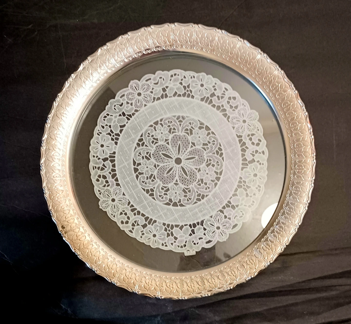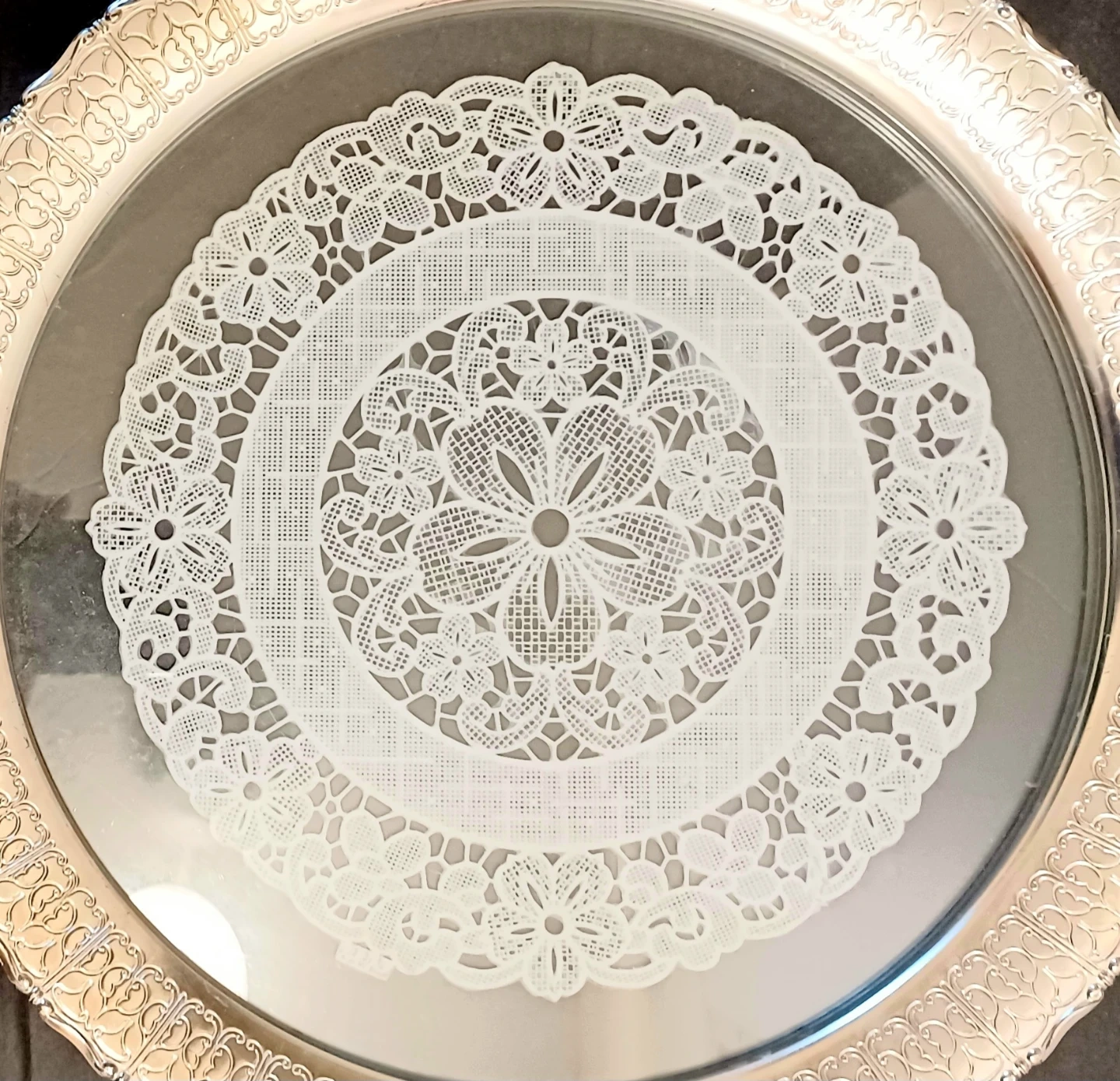 Unique , New Vintage 1960s West German Quist Tarnish Resistant Silver and Glass Tray, Lace Doily Pattern, perfect for displaying cakes or other decorative items.