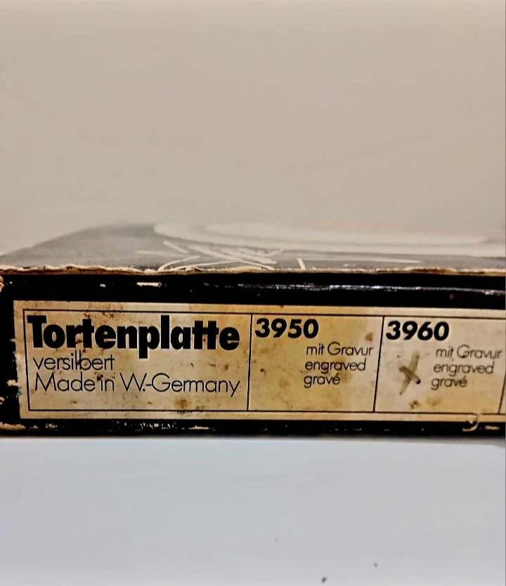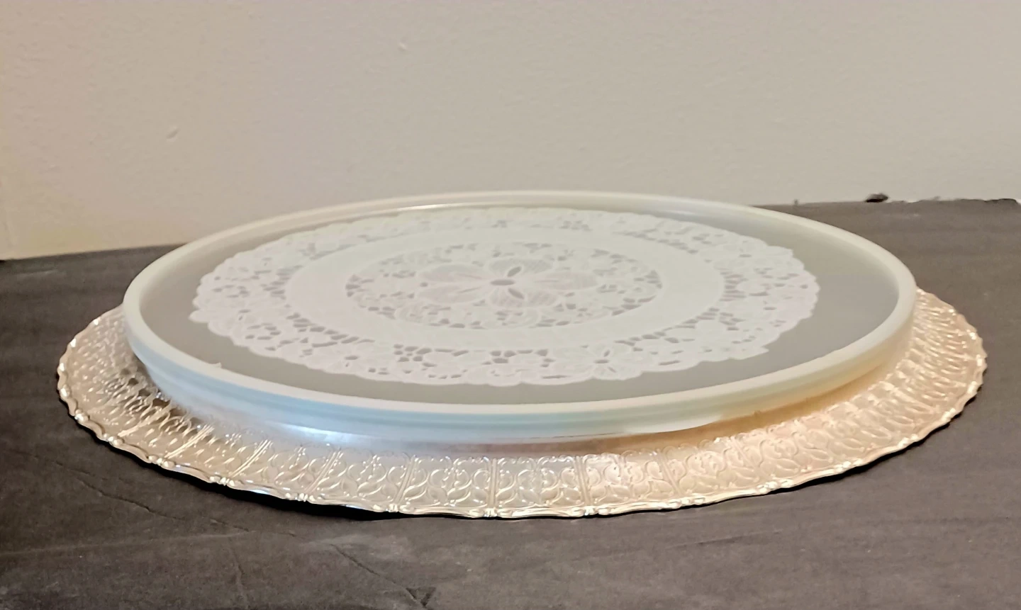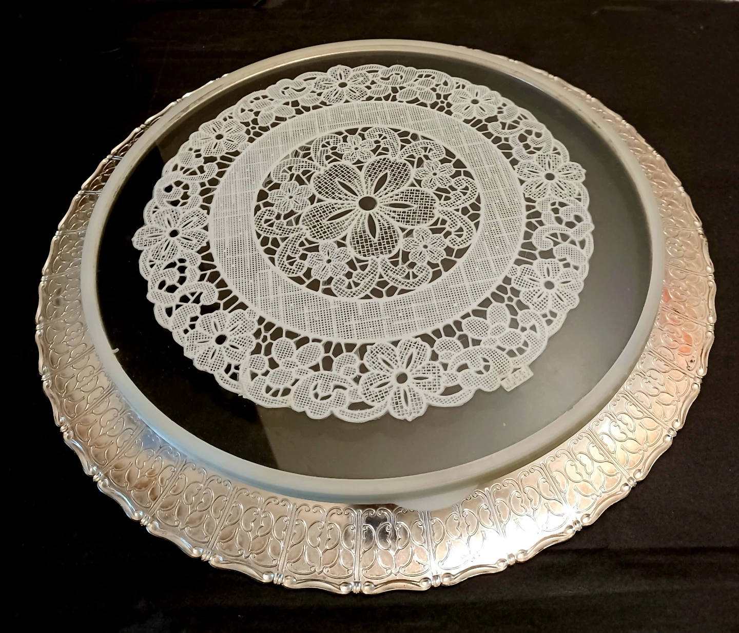 Unique , New Vintage 1960s West German Quist Tarnish Resistant Silver and Glass Tray, Lace Doily Pattern, perfect for displaying cakes or other decorative items.