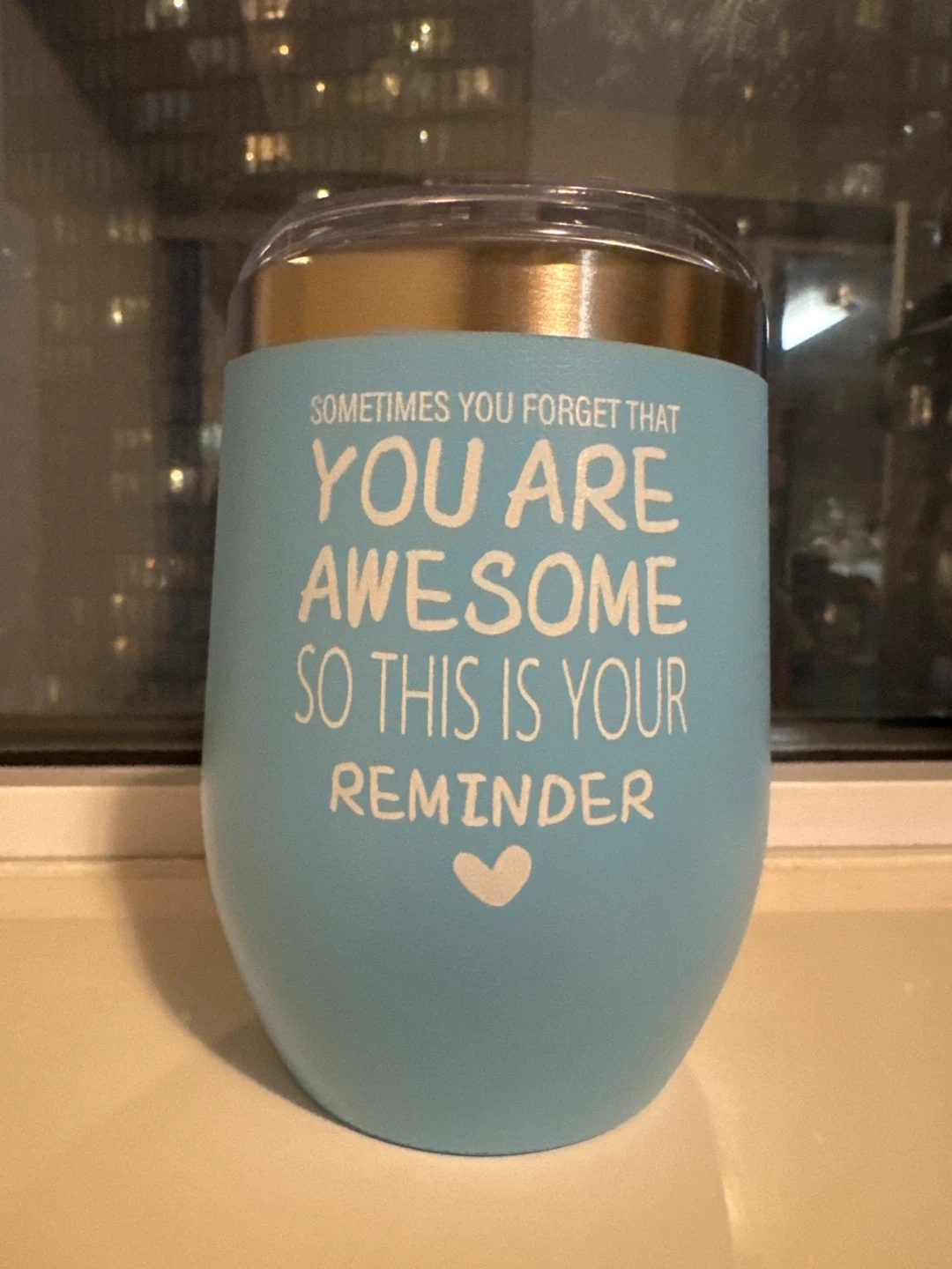 This light blue tumbler has the message "Sometimes you forget that you are awesome, so this is your reminder" printed on it. It's a fun way to stay reminded of your great qualities! It comes with a clear lid (unused)