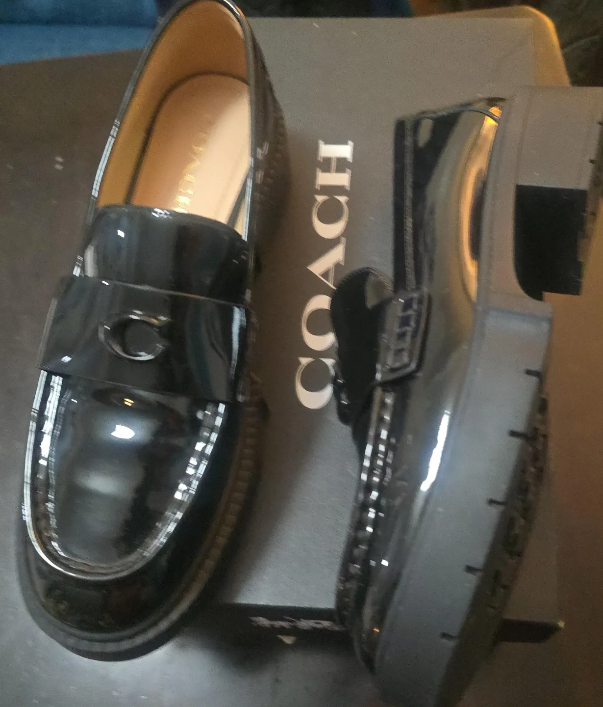 Classic black patent leather loafers from Coach. These stylish shoes feature a comfortable slip-on design with the signature Coach C embellishment. They're crafted with a durable sole for everyday wear. Perfect for dressing up or down!