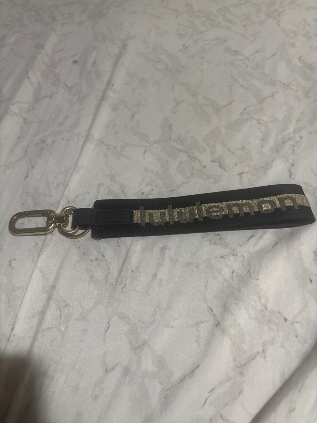 Lululemon wristlet strap with a gold speckled logo. It includes a carabiner clip and ring. This strap is perfect for keeping your keys or small items accessible!