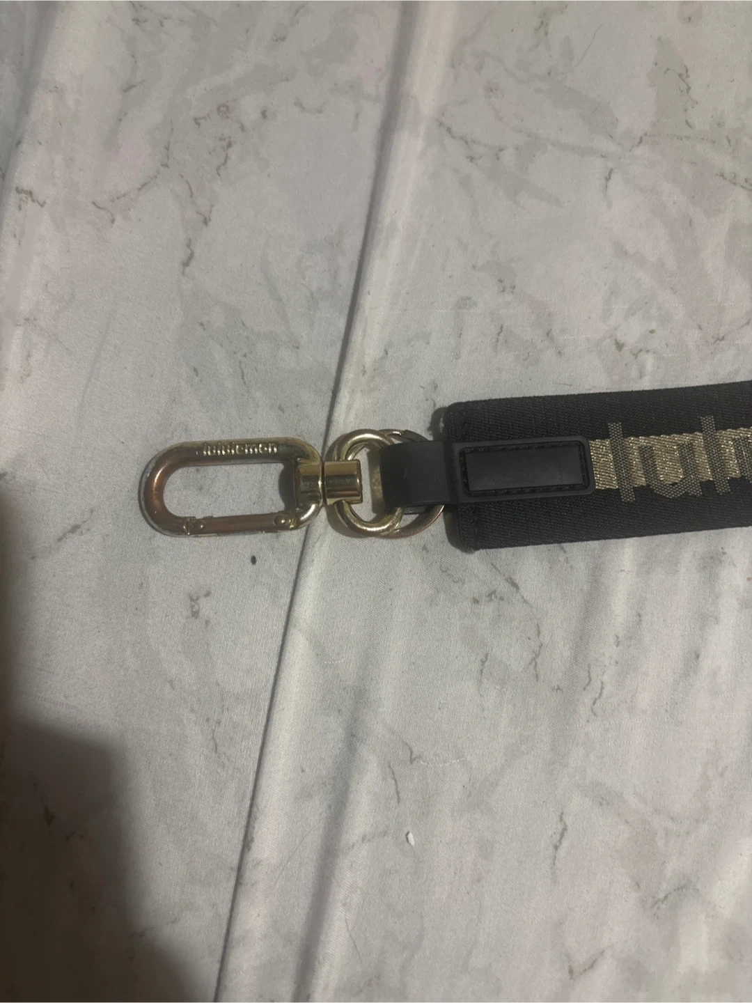 Lululemon wristlet strap with a gold speckled logo. It includes a carabiner clip and ring. This strap is perfect for keeping your keys or small items accessible!