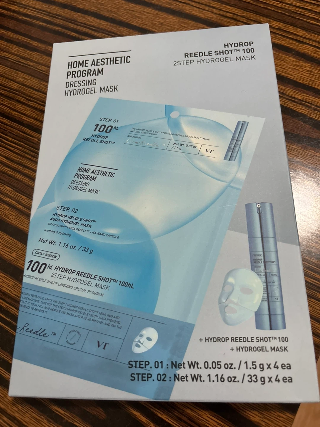 This is a 2-step hydrogel mask program. It includes the Hydrop Reedle Shot 100 serum and an Aqua Hydrogel Mask. The set contains 4 sets of Step 1 (0.05 oz / 1.5g each) and 4 sets of Step 2 (1.16 oz / 33g each).