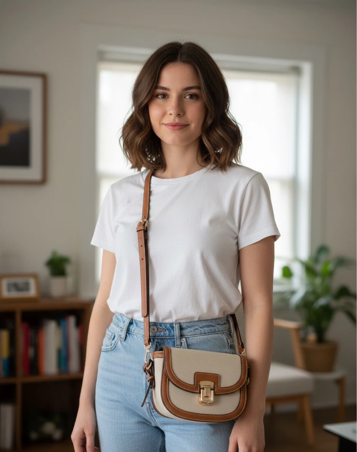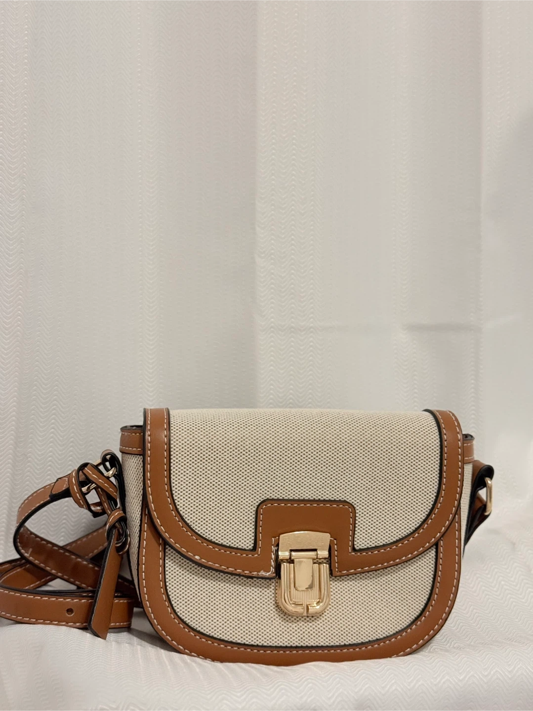 This is a stylish crossbody bag with a canvas body and faux leather trim. It features a secure gold-tone clasp closure and an adjustable strap. And has interior pocket.