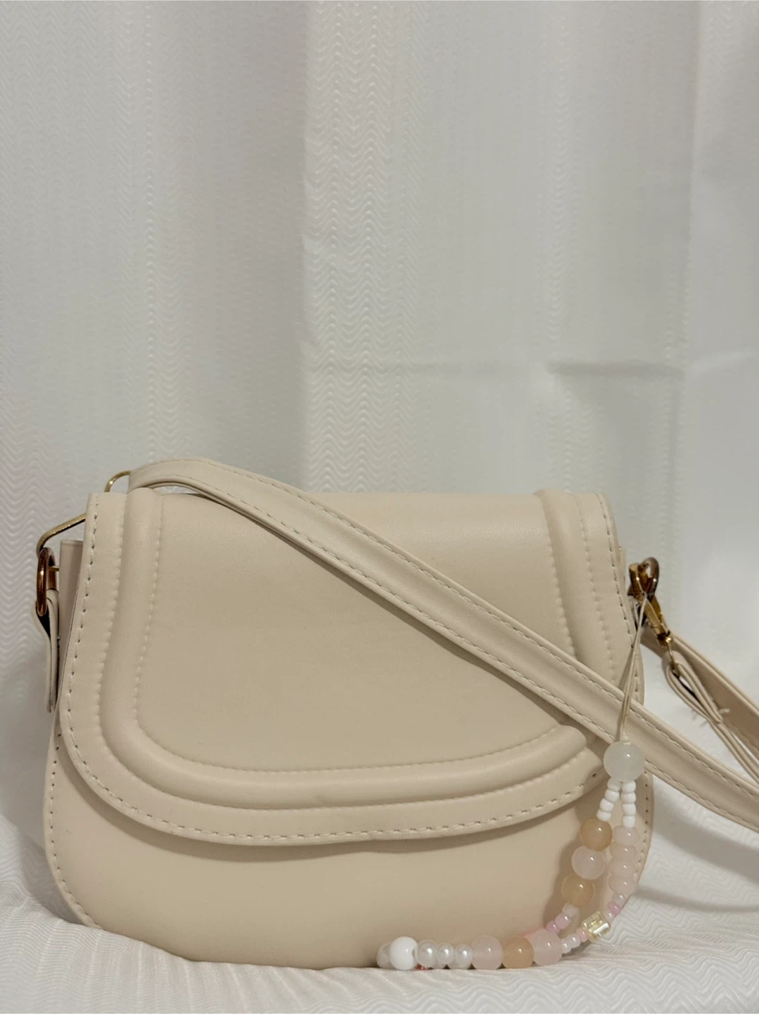 A stylish cream-coloured shoulder bag with a flap closure. It features a decorative beaded charm on the strap. The bag is made from faux leather.