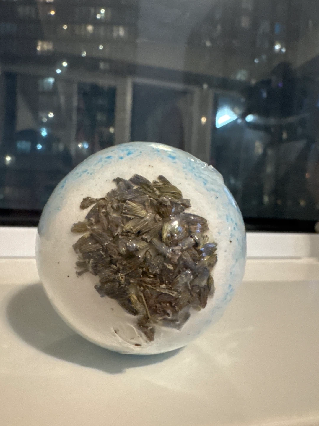 This is a brand new unopened lavender bath bomb. It's infused with real dried lavender buds. It's perfect for a relaxing soak!