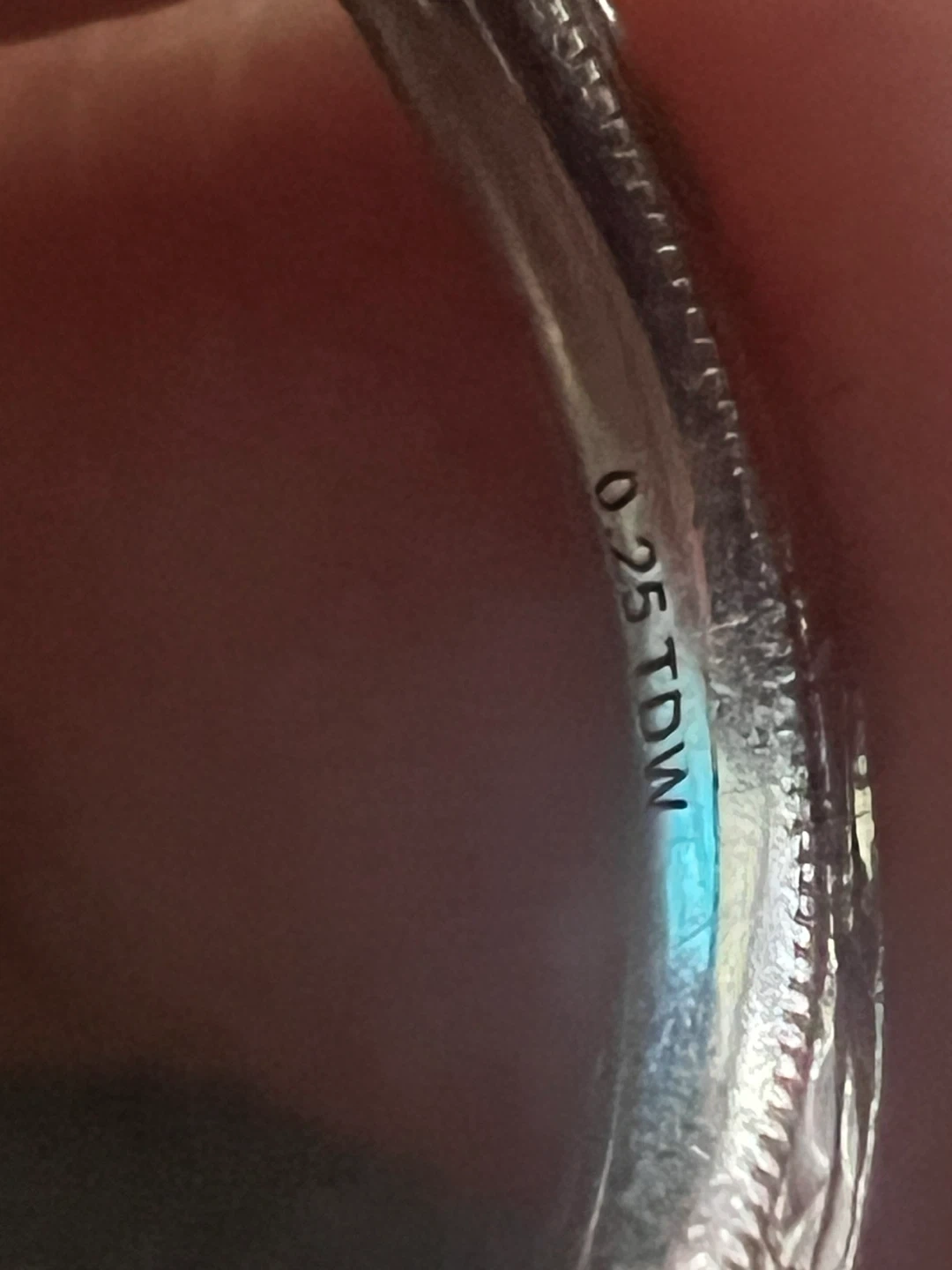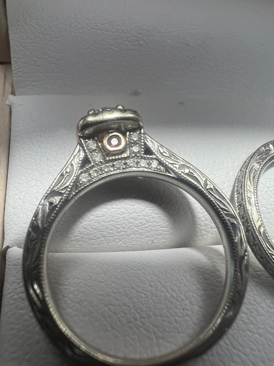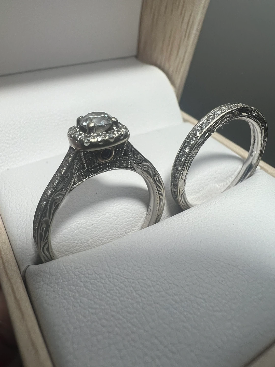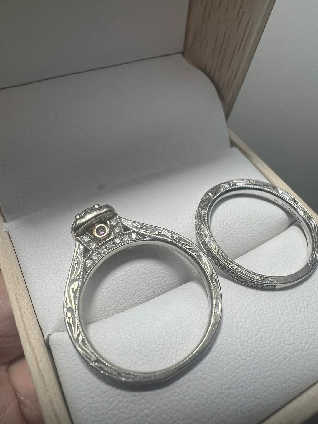Beautiful diamond engagement ring and matching wedding band with intricate engraving. Features small accent diamonds and a central setting with a small natural ruby.