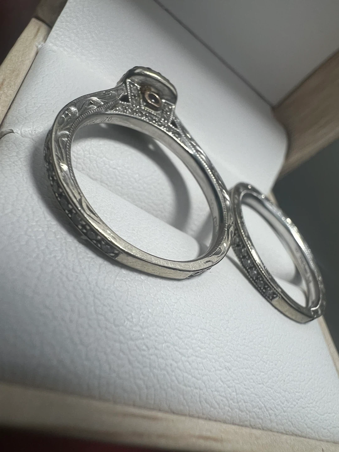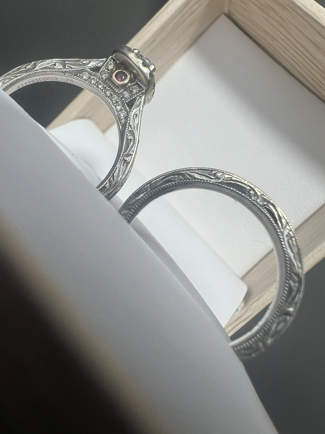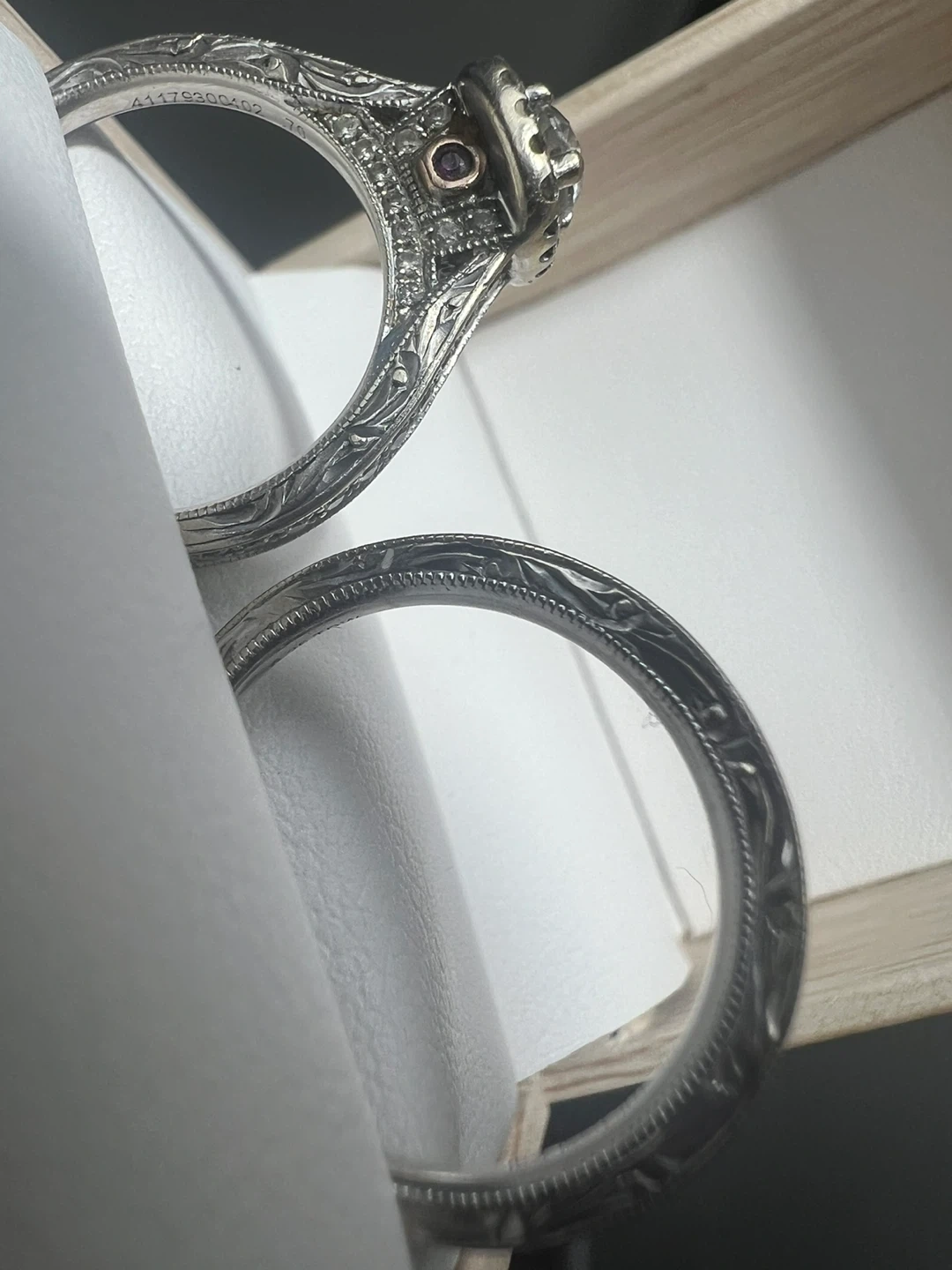 Beautiful diamond engagement ring and matching wedding band with intricate engraving. Features small accent diamonds and a central setting with a small natural ruby.
