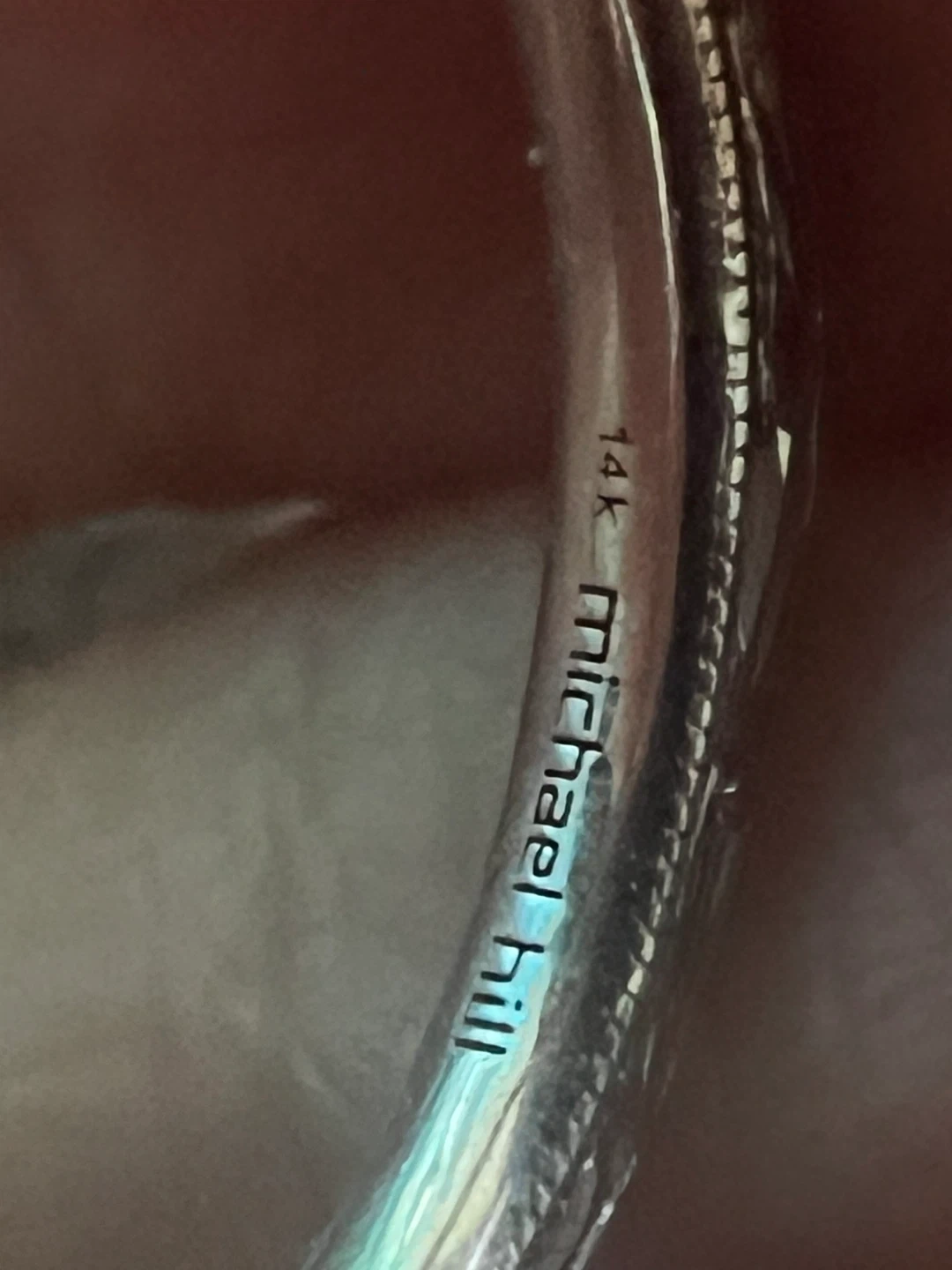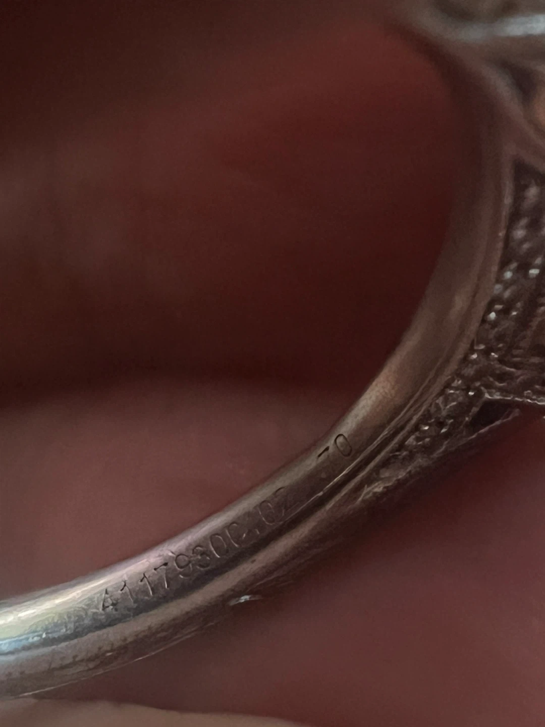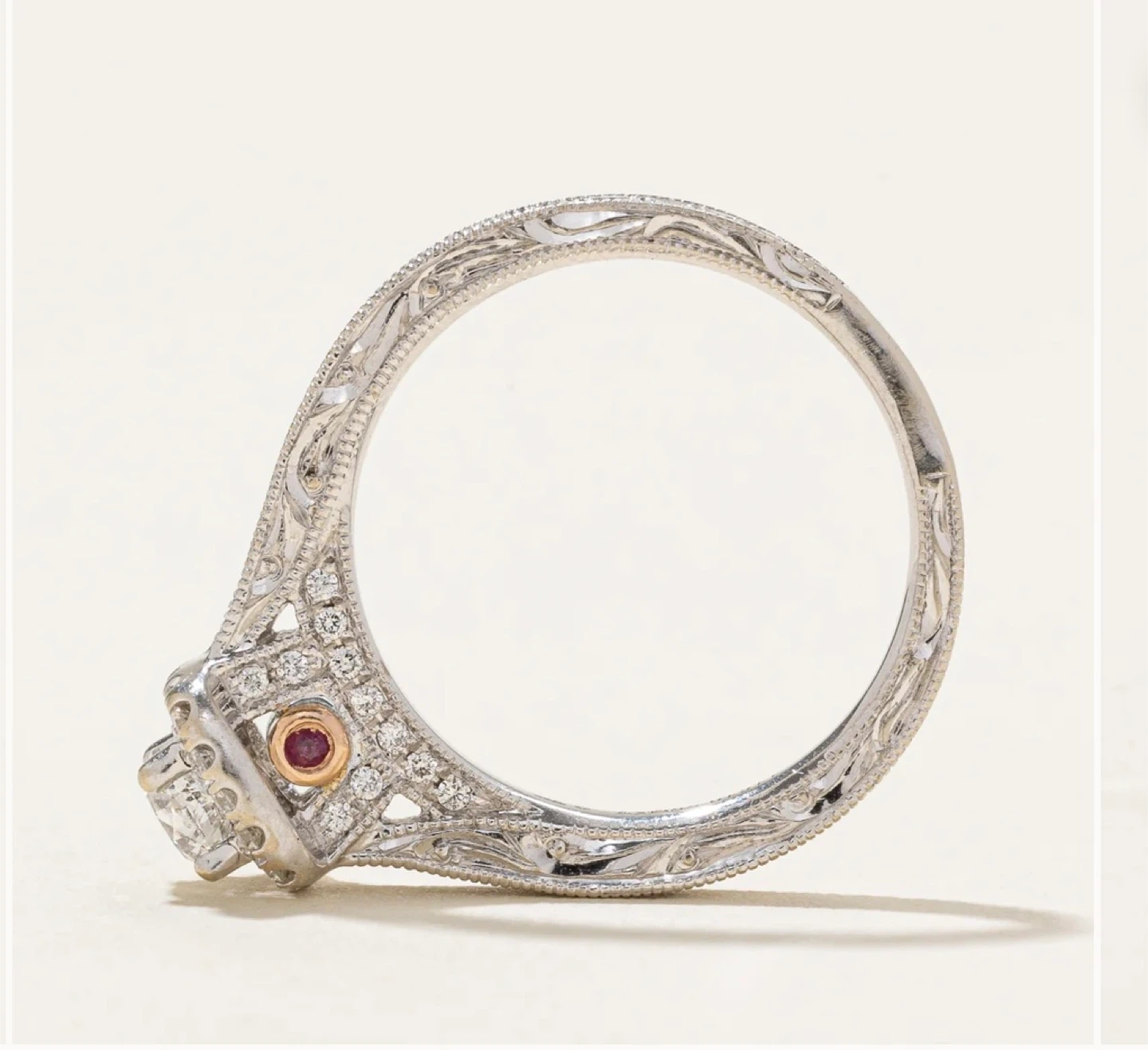 Beautiful diamond engagement ring and matching wedding band with intricate engraving. Features small accent diamonds and a central setting with a small natural ruby.