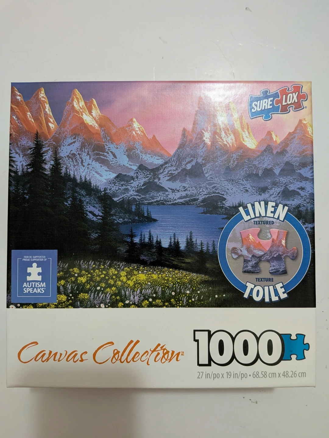 This Sure Lox 1000 piece jigsaw puzzle features a beautiful mountain landscape. It's from the Canvas Collection with a linen and toile textured finish. Puzzle dimensions are 27 in. x 19 in. (68.58 cm x 48.26 cm).
