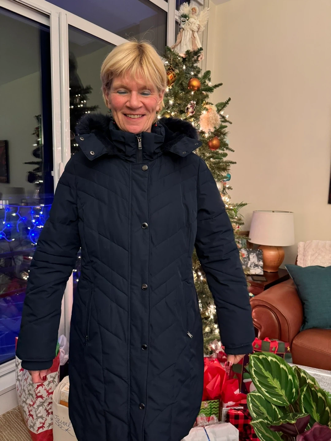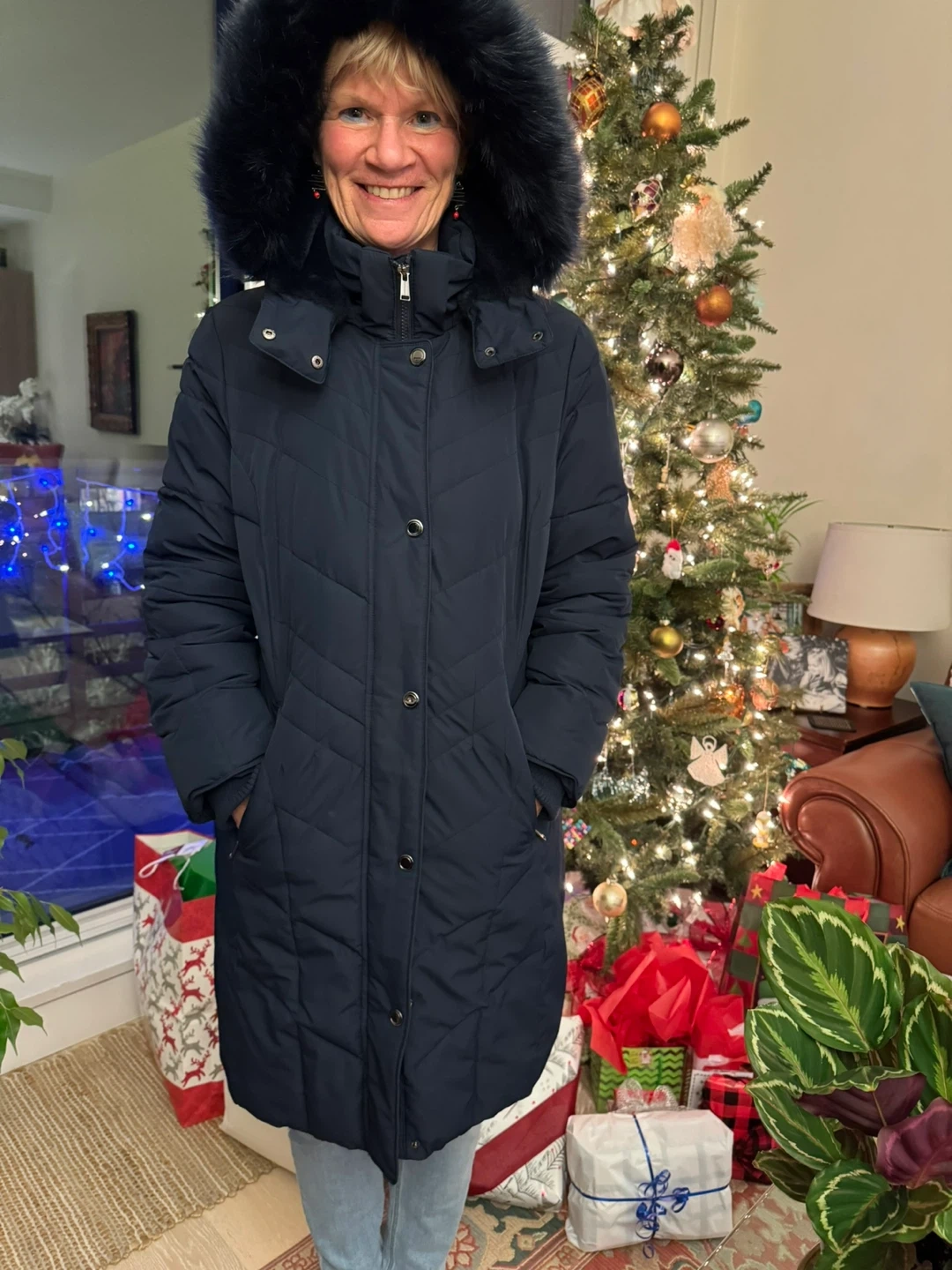 Stay warm this winter in this stylish navy blue quilted parka. It features a full zip front and a cozy faux fur hood. Two zippered pockets to keep keys safe and hands warm. The quilted design adds a touch of elegance. Perfect for cold eastern Canadian days! Worn only twice and no longer fits me. Original price was $325.