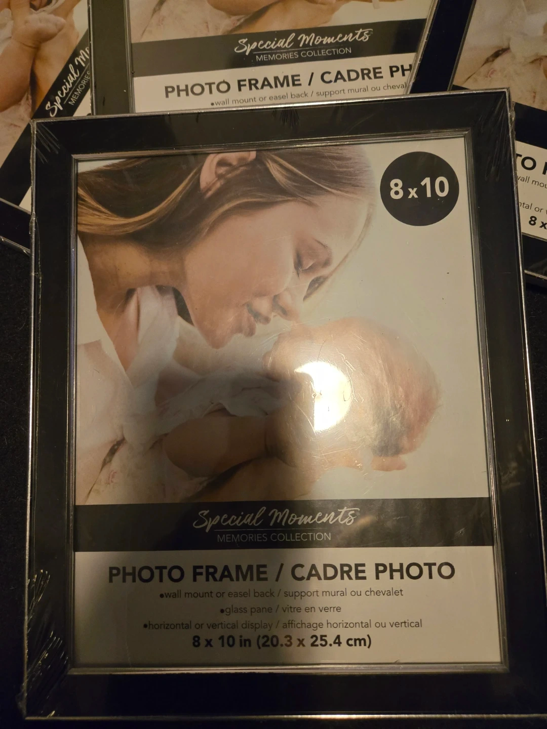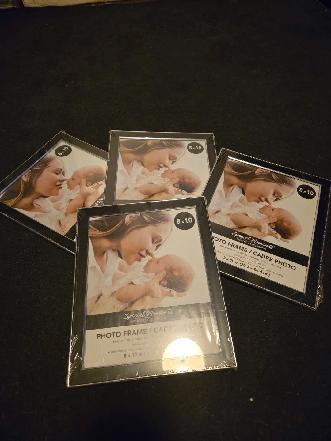 Four 8x10 photo frames from the Special Moments Memories Collection. Each frame is black with glass panels and can be displayed wall mount or as an easel back. Horizontal or vertical display options are available. Brand new in packaging