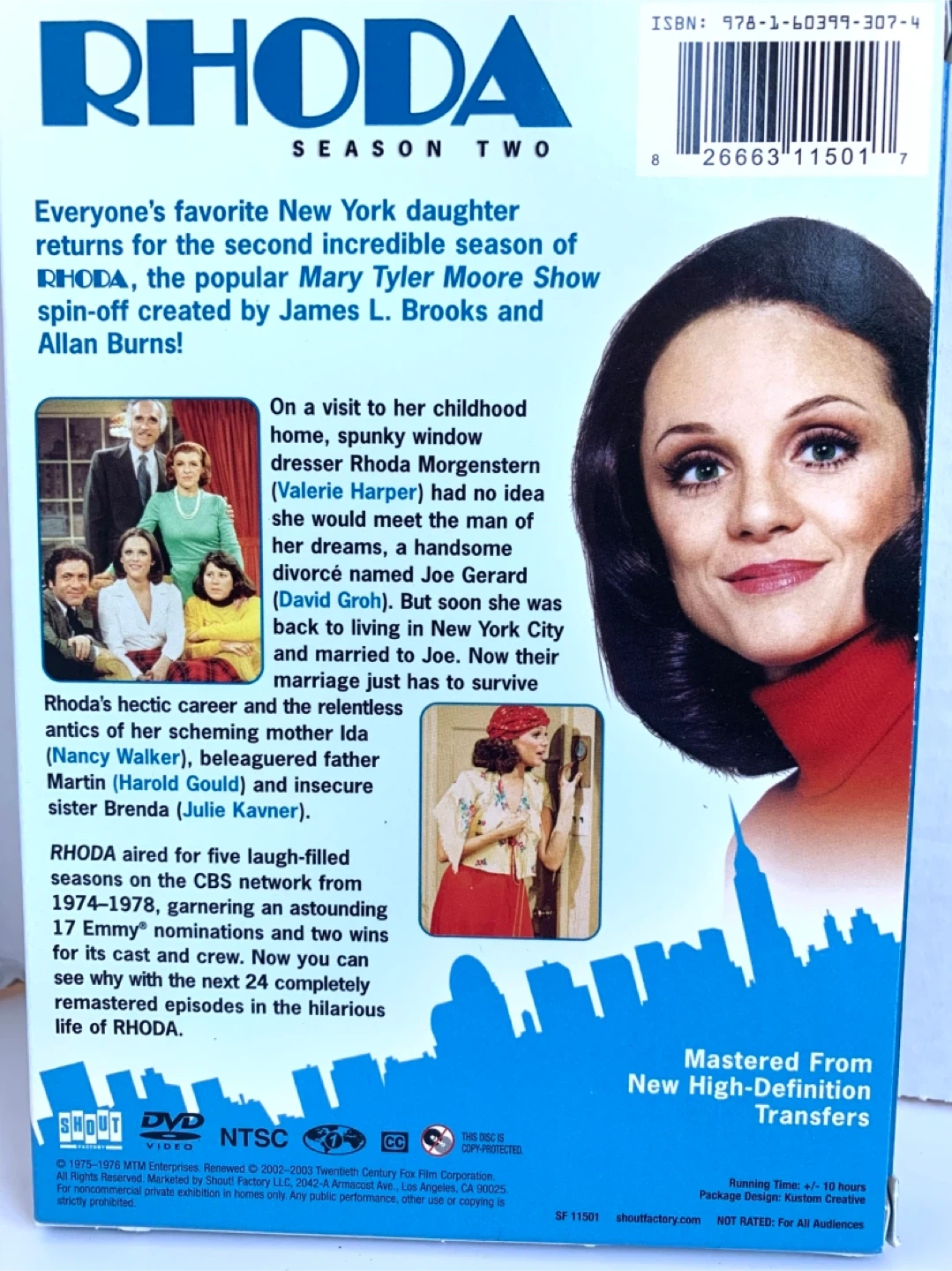 This DVD set features Rhoda Season Two. It includes four discs with all the episodes from the second season of the popular Mary Tyler Moore Show spin-off. Episodes include "Kiss Your Epaulets Goodbye" through "Don't Give Up The Office". Running time is +/- 10 hours.