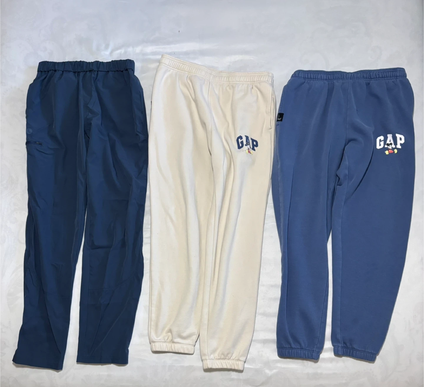 Bundle includes a pair of navy athletic joggers and two pairs of Gap sweatpants. One Gap pair is cream coloured with a Mickey Mouse graphic, and the other is blue with a Mickey Mouse graphic.