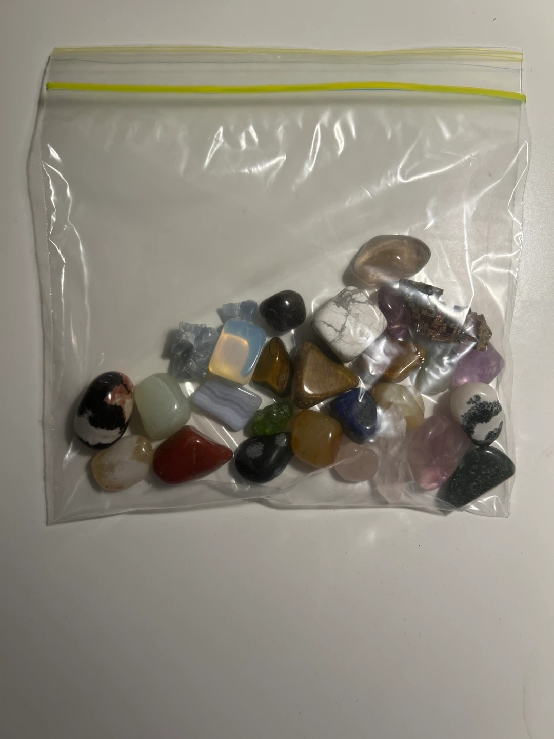 This bag contains a collection of tumbled gemstones and small crystals. It includes various colours and types of polished stones. This assortment is great for craft projects or for collectors.