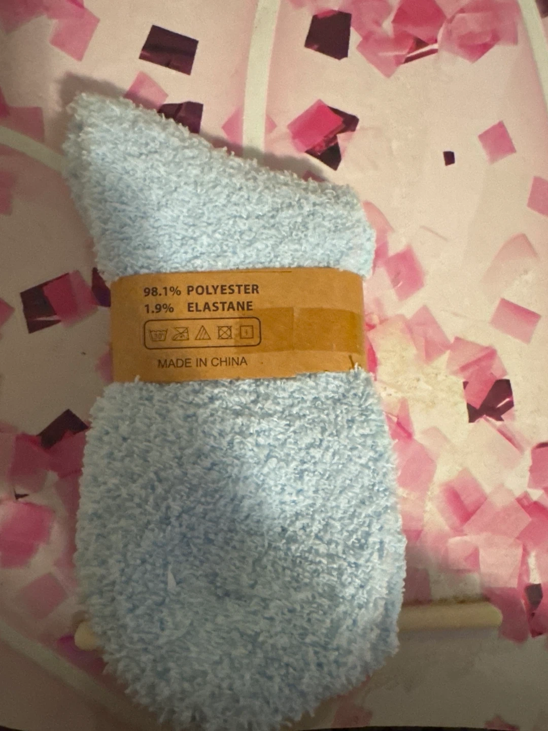 Cozy fuzzy socks in a light blue hue. These socks are made from 98.1% polyester and 1.9% elastane. They're perfect for keeping your feet warm and comfy! Unused, unopened