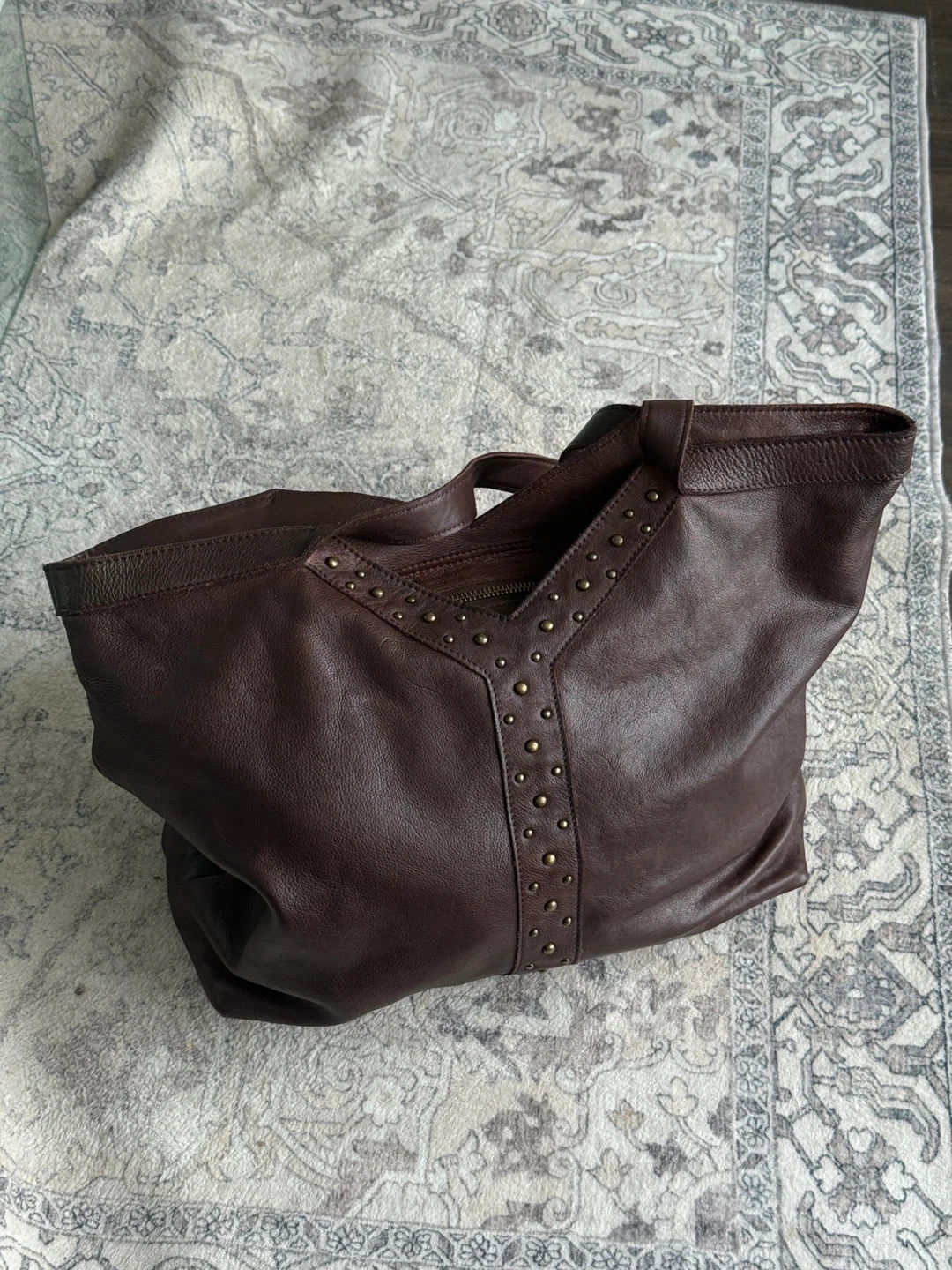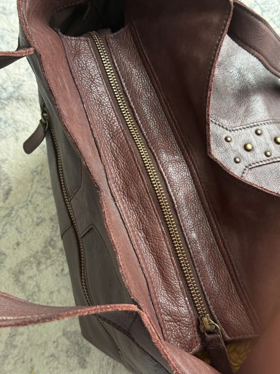 This is a stylish brown leather tote bag. It features decorative brass-tone studs along the front panel. The interior has a zippered pocket and a main zippered closure. Leather material.
