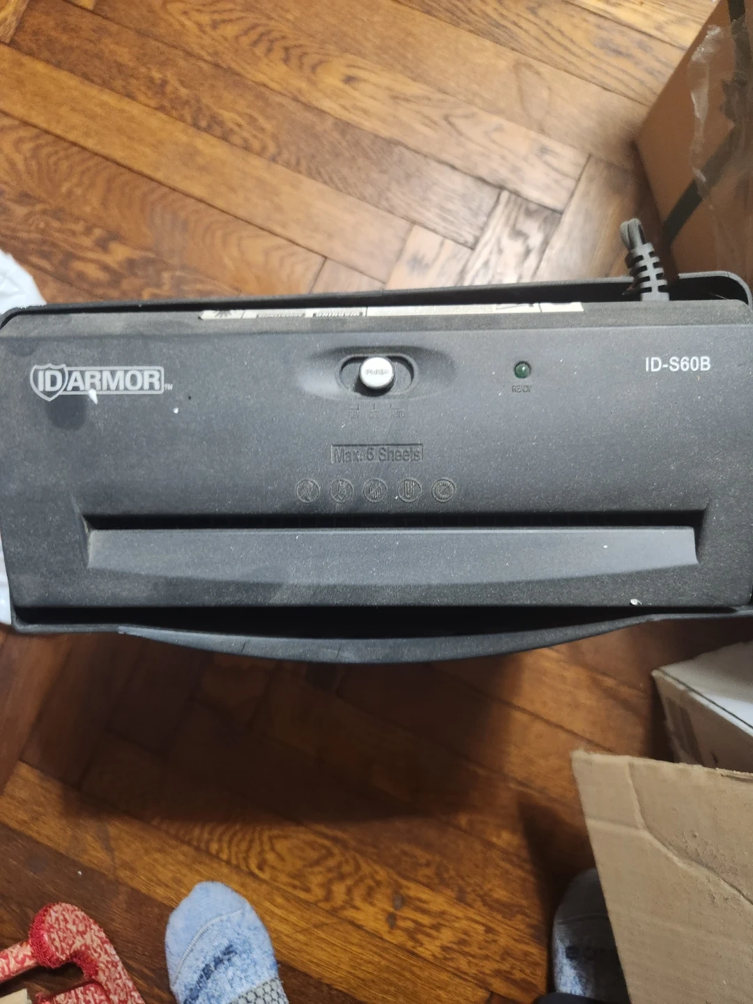 Armor light duty paper shredder. Model ID-S60B. Shreds up to 6 sheets at a time. It's suitable for personal use. A green indicator light shows when it's ready to use.
