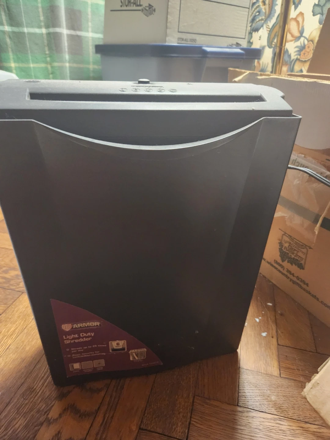 Armor light duty paper shredder. Model ID-S60B. Shreds up to 6 sheets at a time. It's suitable for personal use. A green indicator light shows when it's ready to use.