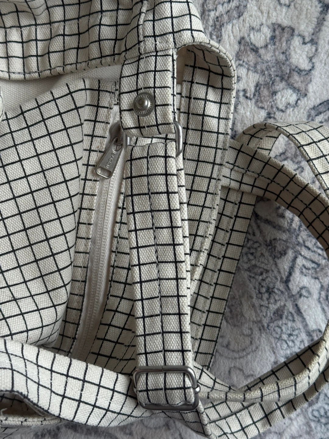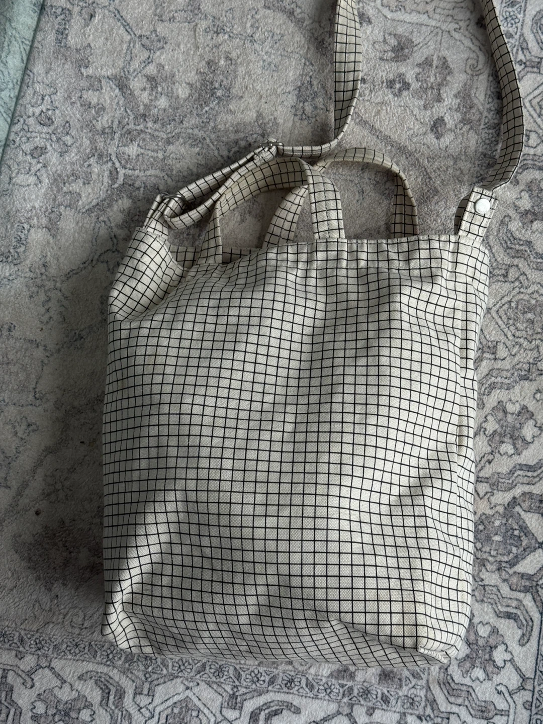 This BAGGU tote bag is made from durable canvas with a classic black and white grid pattern. It features dual top handles and a detachable crossbody strap for versatile carrying. The main compartment is secured with a zip closure. It's a practical bag for everyday use!