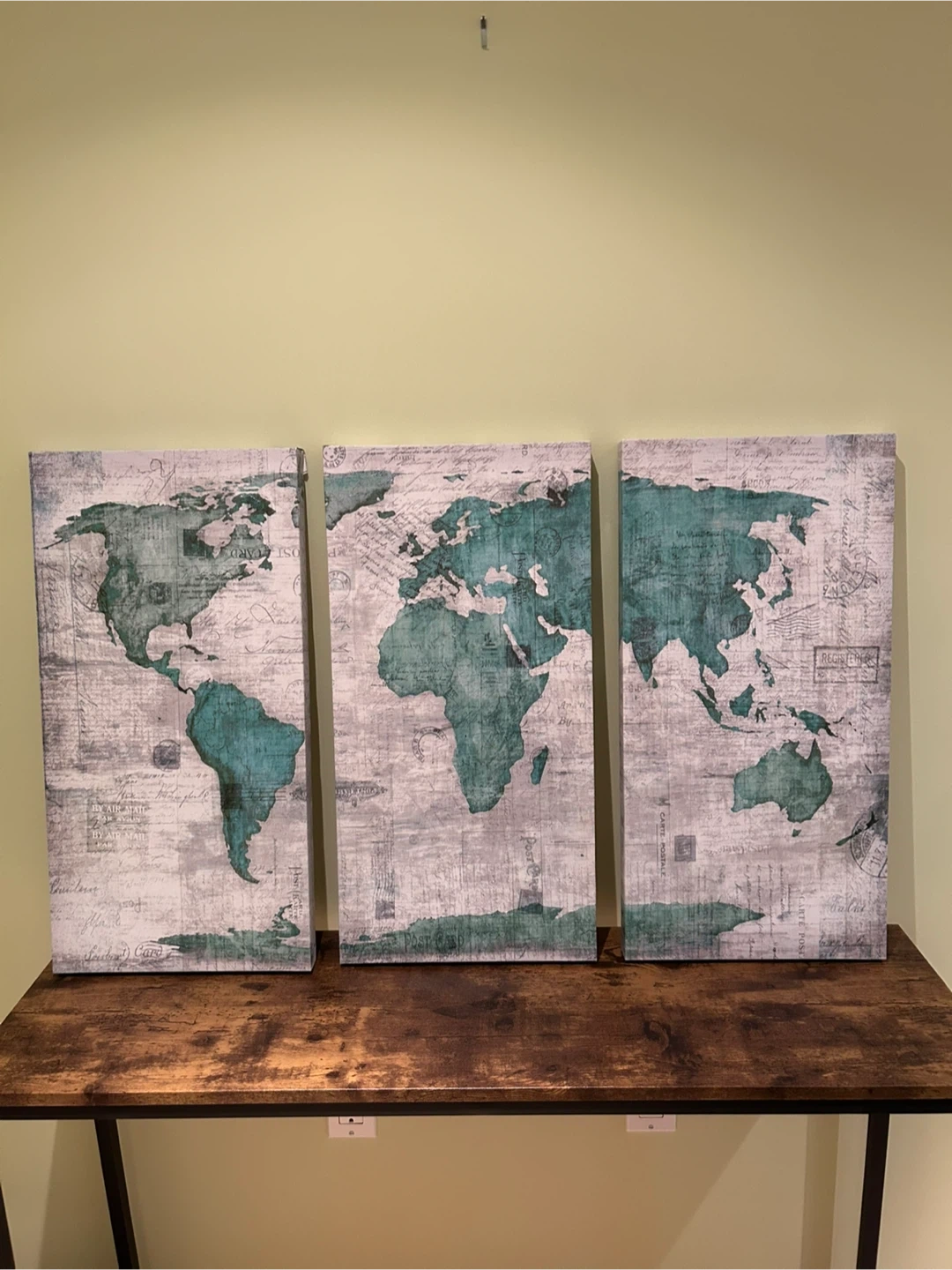 This set features three canvas pieces displaying a world map. The artwork has a vintage look with teal and grey tones. It's a great statement piece for any room!
