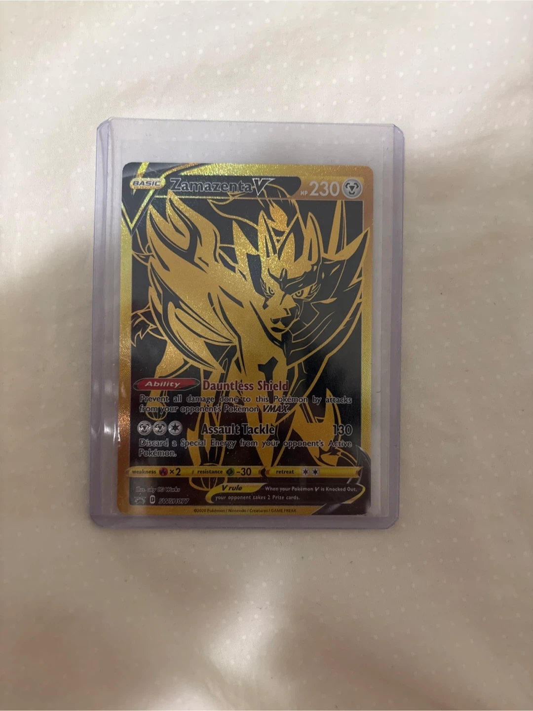 This is the Zamazenta V card from the Pokemon Trading Card Game in mint condition. It has 230 HP and the 'Dauntless Shield' ability. Its 'Assault Tackle' attack does 130 damage. This card is for collectors and players.