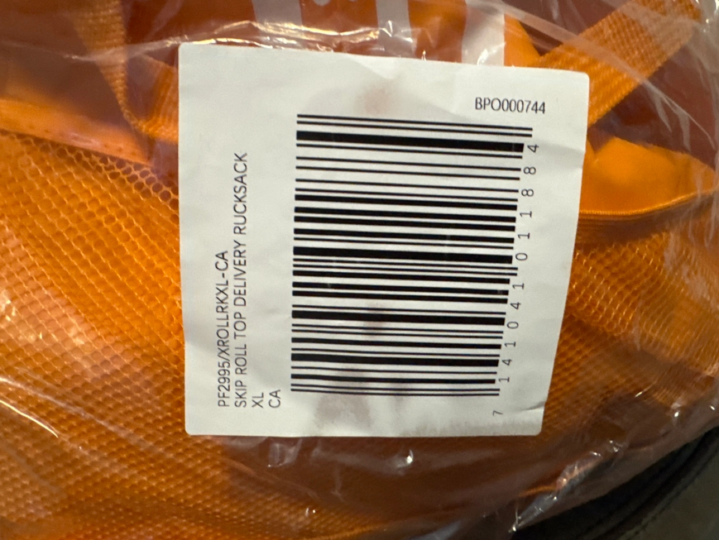 This is an orange XL skip roll top delivery rucksack. It's designed for delivery purposes. The material appears to be durable for carrying items.