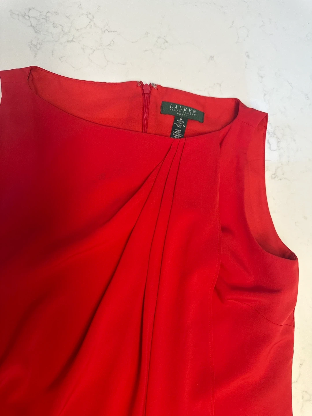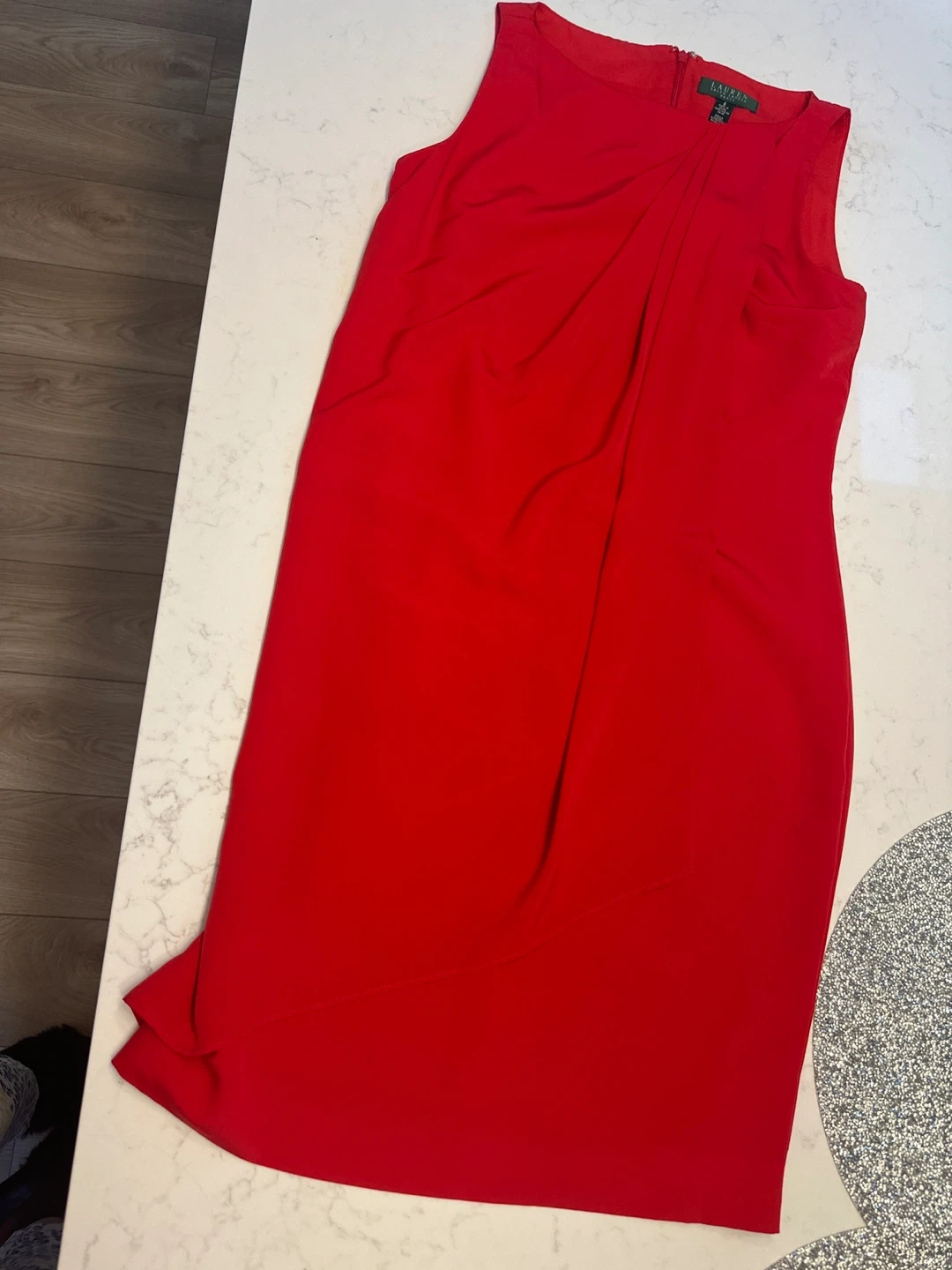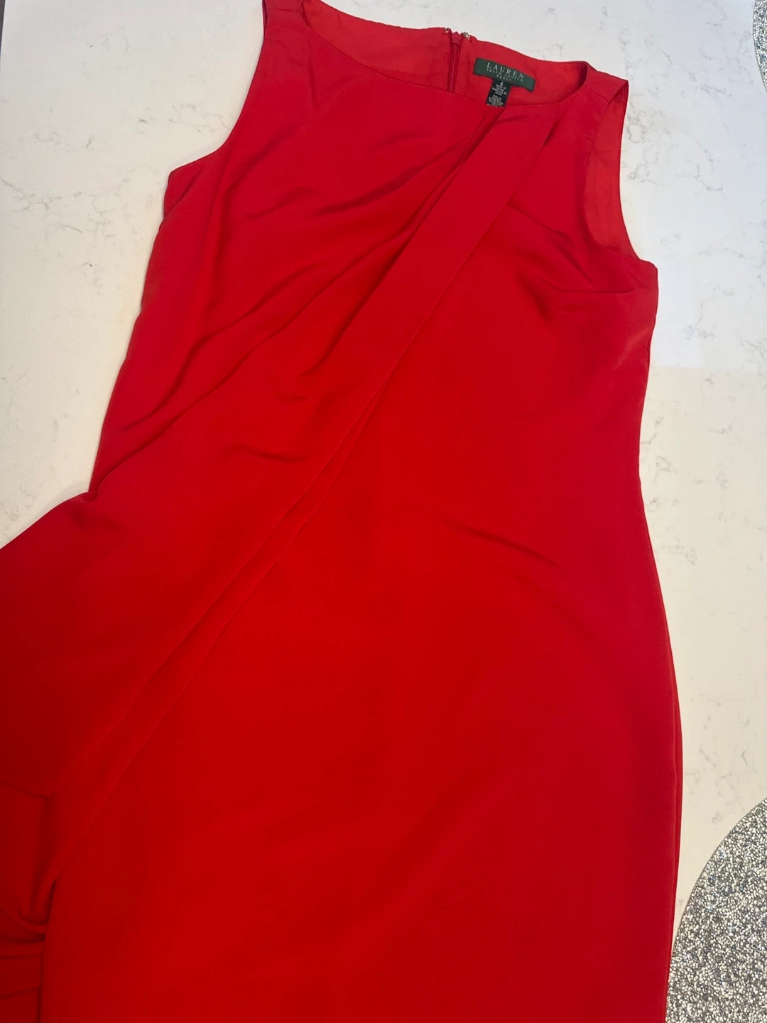 Lauren Ralph Lauren sleeveless sheath dress in a vibrant red. It features a flattering draped detail across the front. Perfect for dressy occasions!