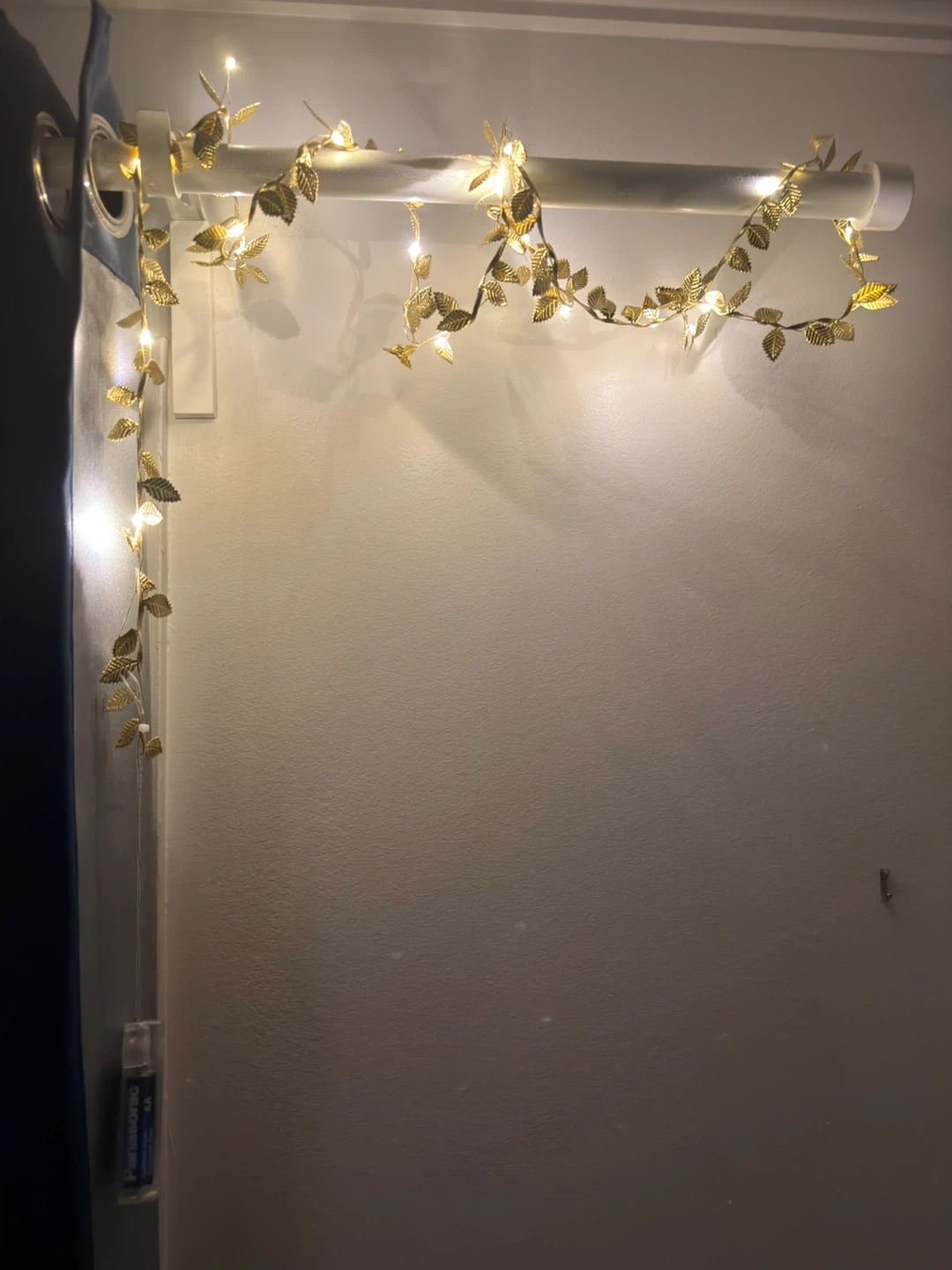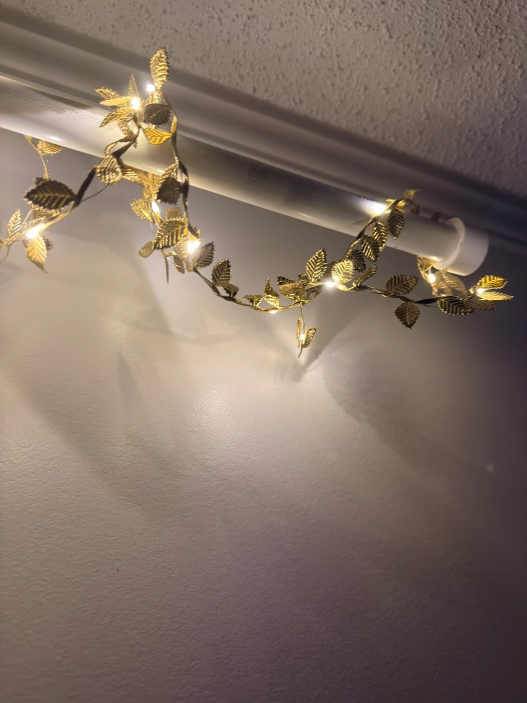 Decorative gold leaf string lights add a warm glow. Battery operated for easy placement anywhere! Perfect for adding a touch of elegance to your home decor.