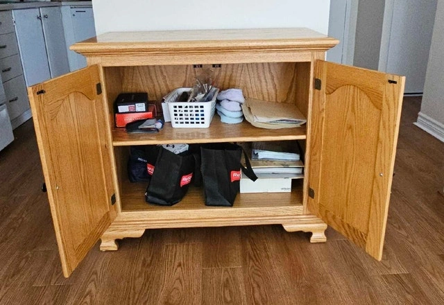 This is a lovely, used side hutch, perfect for adding storage and style to any room. It's in good condition and ready to find a new home. The cabinet features two doors opening to reveal a storage shelf inside. This charming piece has served us well, but we're redecorating and it's time for it to move on to someone who can appreciate its classic appeal. Because the ad is still up, it's still available, ready to bring a touch of vintage charm to your space! Contents are not included. Cash accepted.