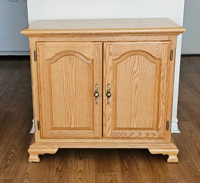 This is a lovely, used side hutch, perfect for adding storage and style to any room. It's in good condition and ready to find a new home. The cabinet features two doors opening to reveal a storage shelf inside. This charming piece has served us well, but we're redecorating and it's time for it to move on to someone who can appreciate its classic appeal. Because the ad is still up, it's still available, ready to bring a touch of vintage charm to your space! Contents are not included. Cash accepted.