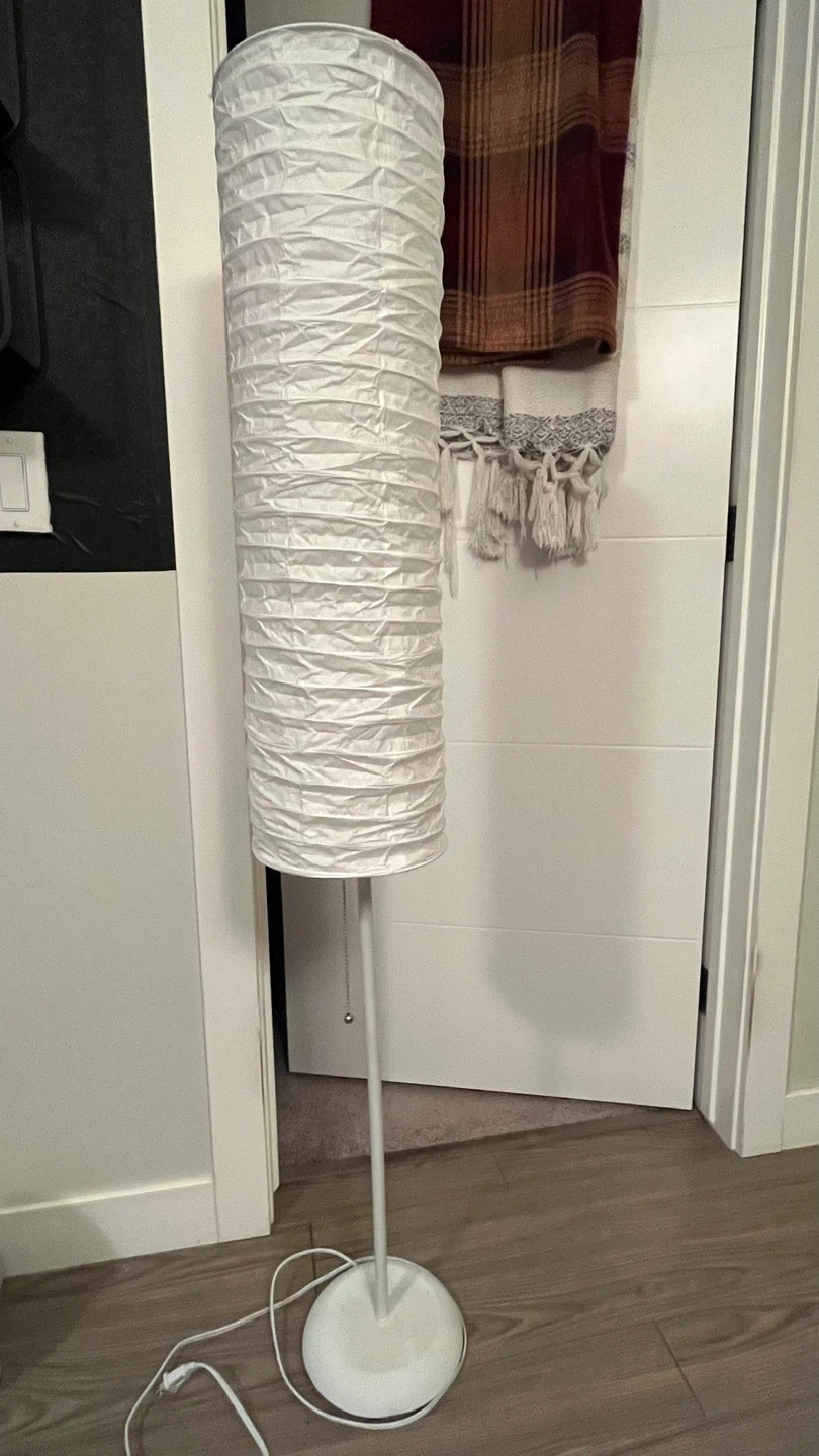 Provides a soft, ambient glow. It's tall and cylindrical with a white metal stand and base. The paper shade has a textured, crinkled design. Comes already assembled.