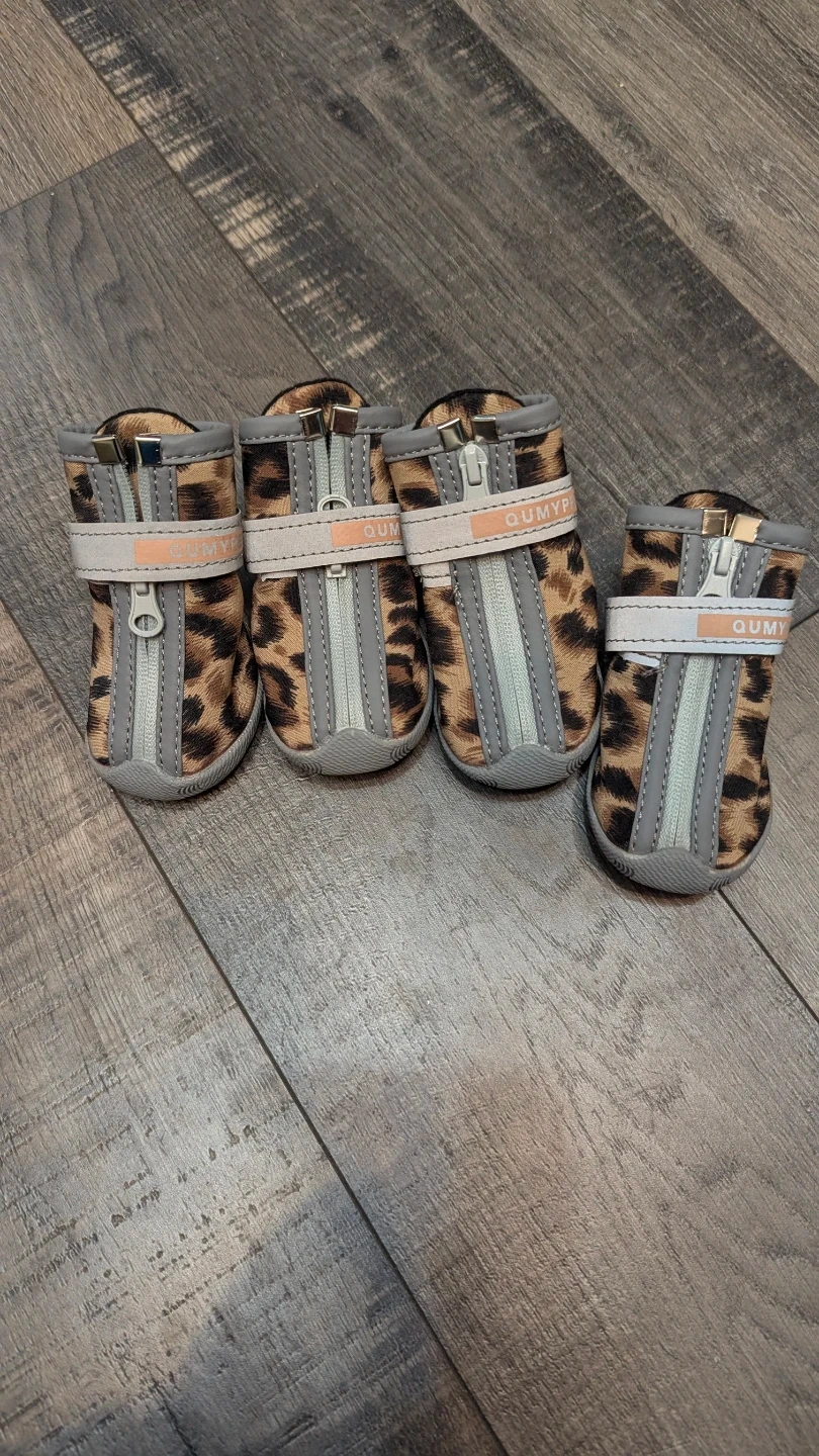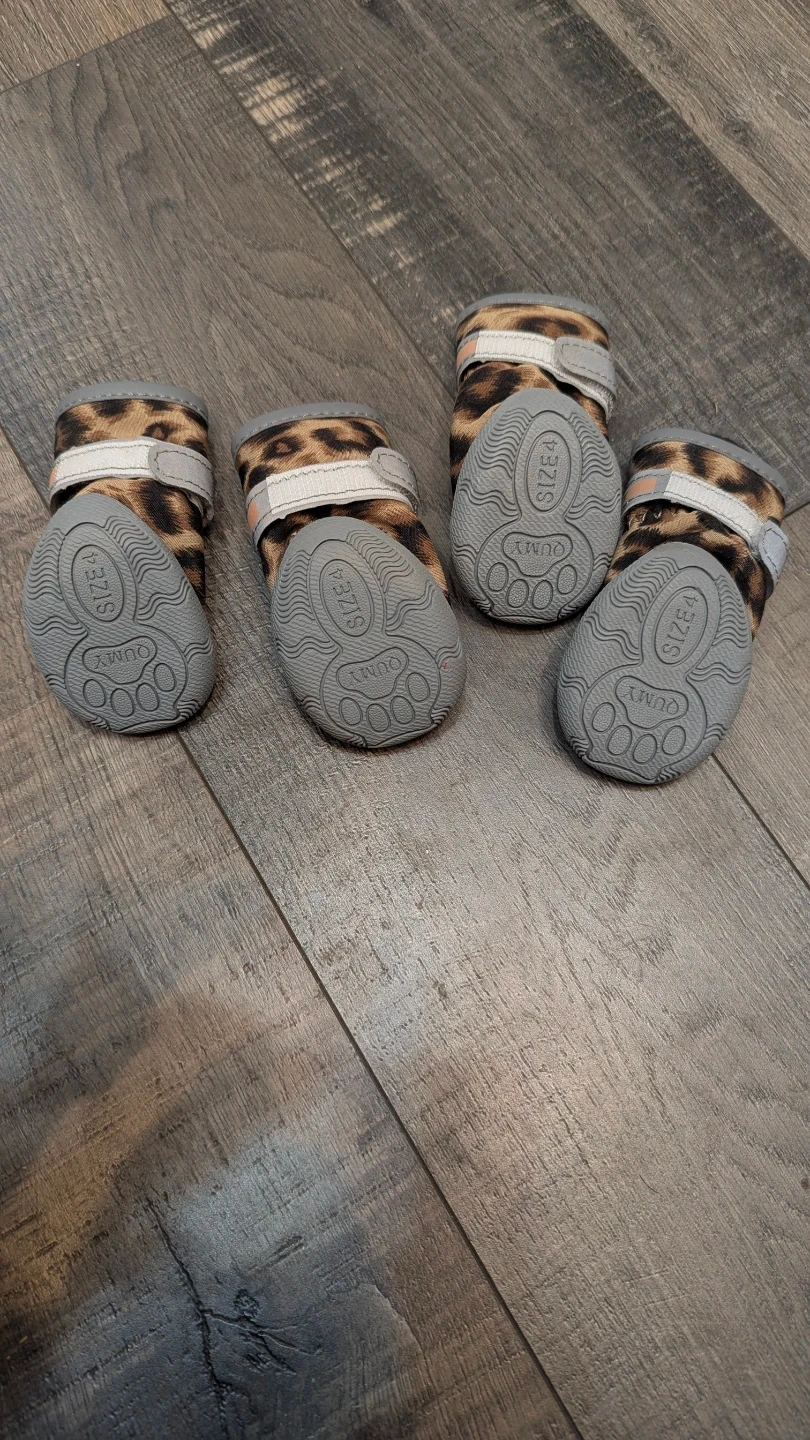 Set of 4 QUMY brand dog boots in leopard print. Size 4, suitable for dogs weighing 17-22 lbs. These boots have adjustable straps for a secure fit and durable soles.