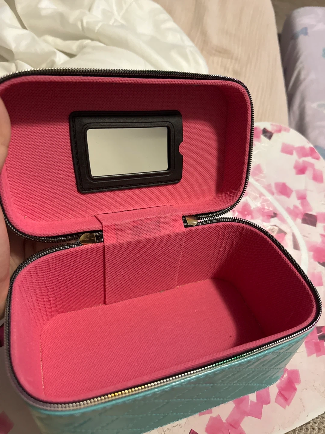 This cute teal vanity case features a quilted design and a convenient mirror inside. It's perfect for storing your makeup and toiletries on the go. The interior is lined with soft pink fabric for added protection. It is unused