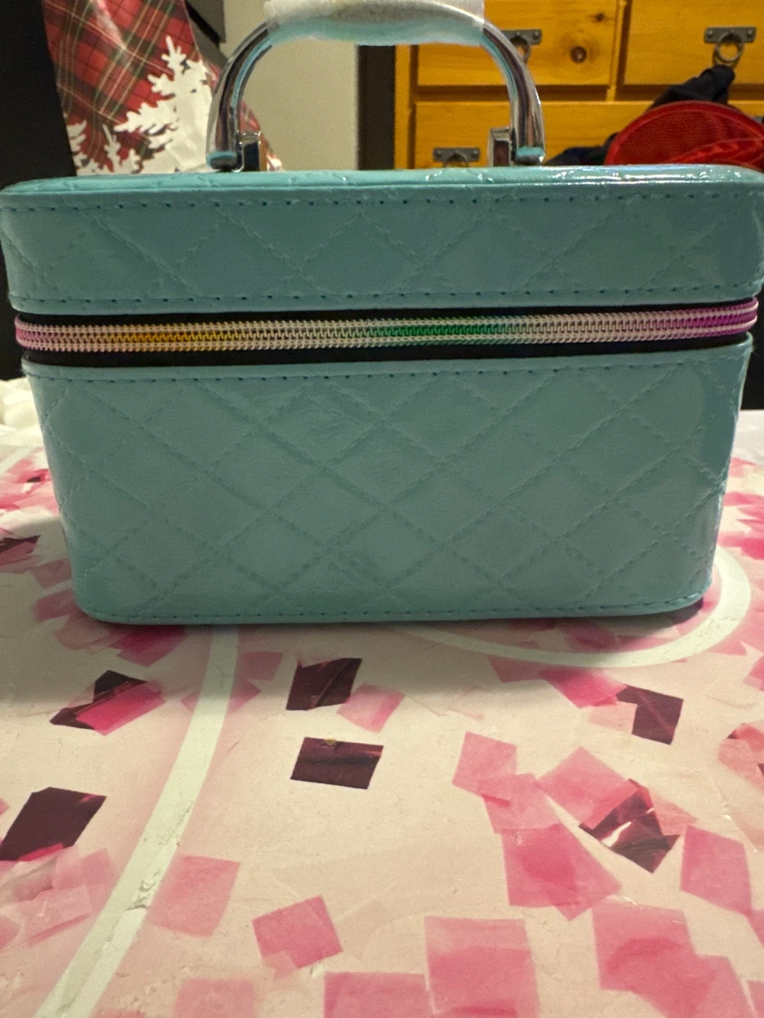 This cute teal vanity case features a quilted design and a convenient mirror inside. It's perfect for storing your makeup and toiletries on the go. The interior is lined with soft pink fabric for added protection. It is unused