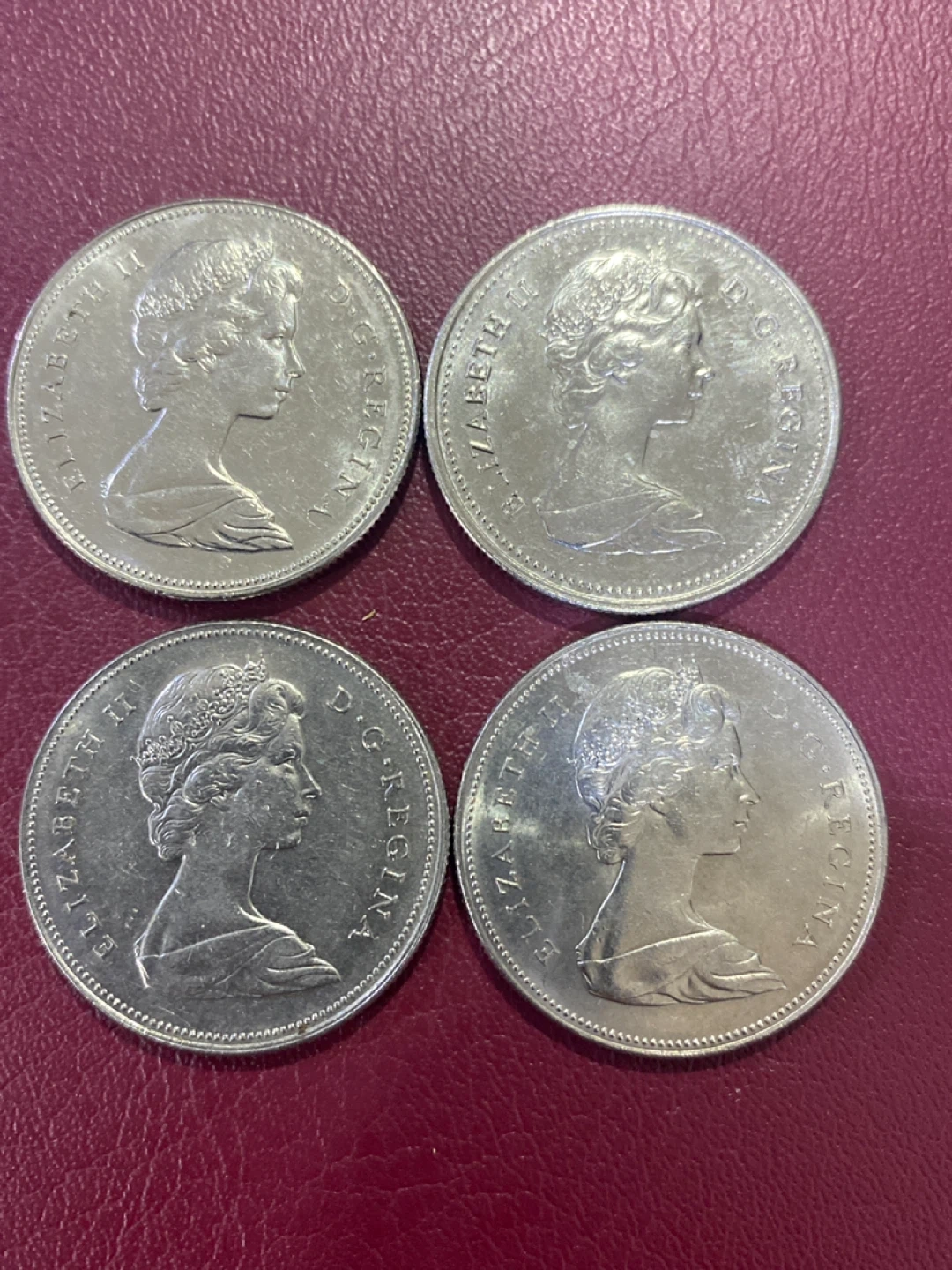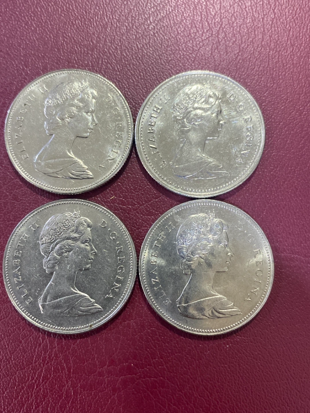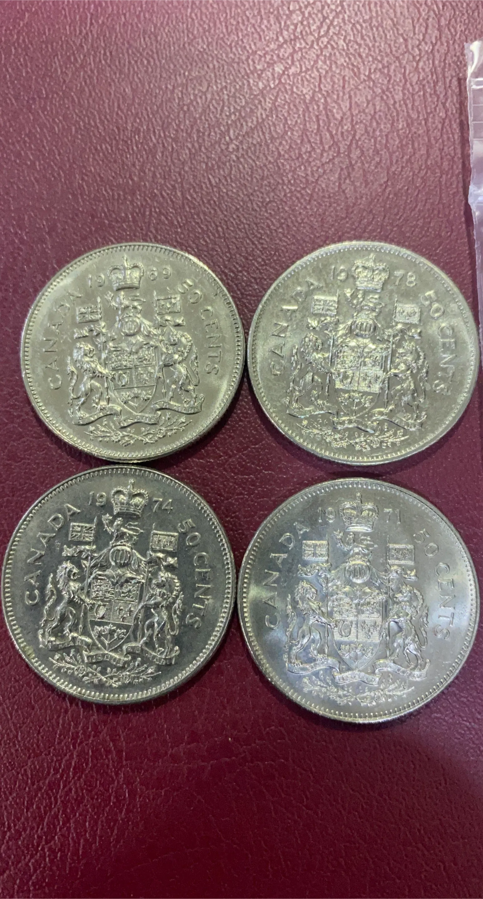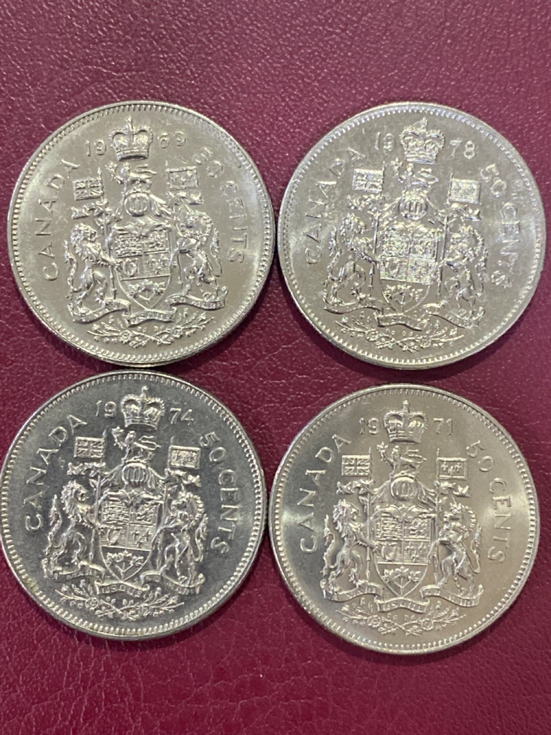 Four Canadian 50 cent coins featuring Queen Elizabeth II and the Royal Coat of Arms. Years include 1969, 1971, 1974, and 1978. These coins are made of cupronickel.