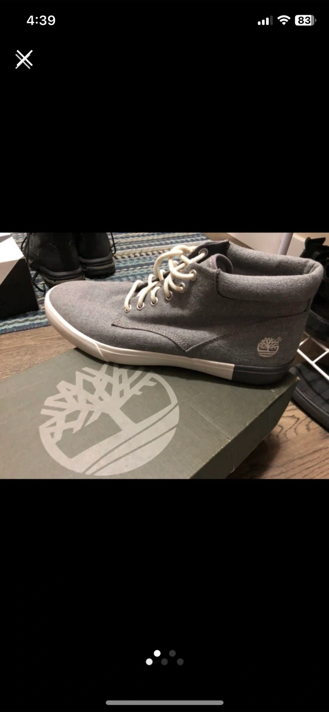 Men's Timberland chukka boots in grey canvas. White laces and a flat sole. Size 9.5.wore a few times like new paid over $80 sell for $40 firm thanks.