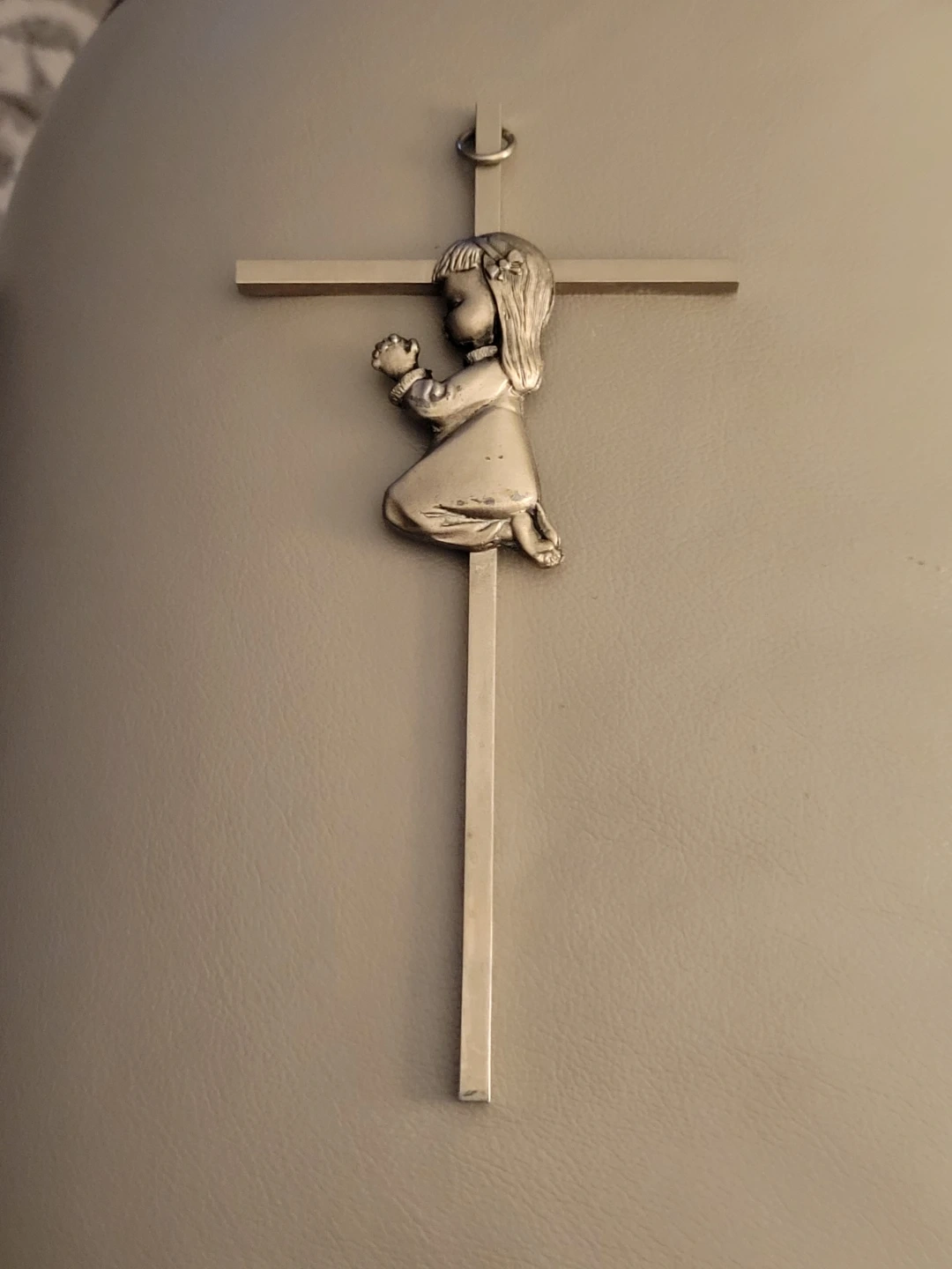 This delicate Baptism or First Communion Cross is a meaningful keepsake. The cross features a praying girl. It is a beautiful, gently used item that would be perfect for a special occasion.