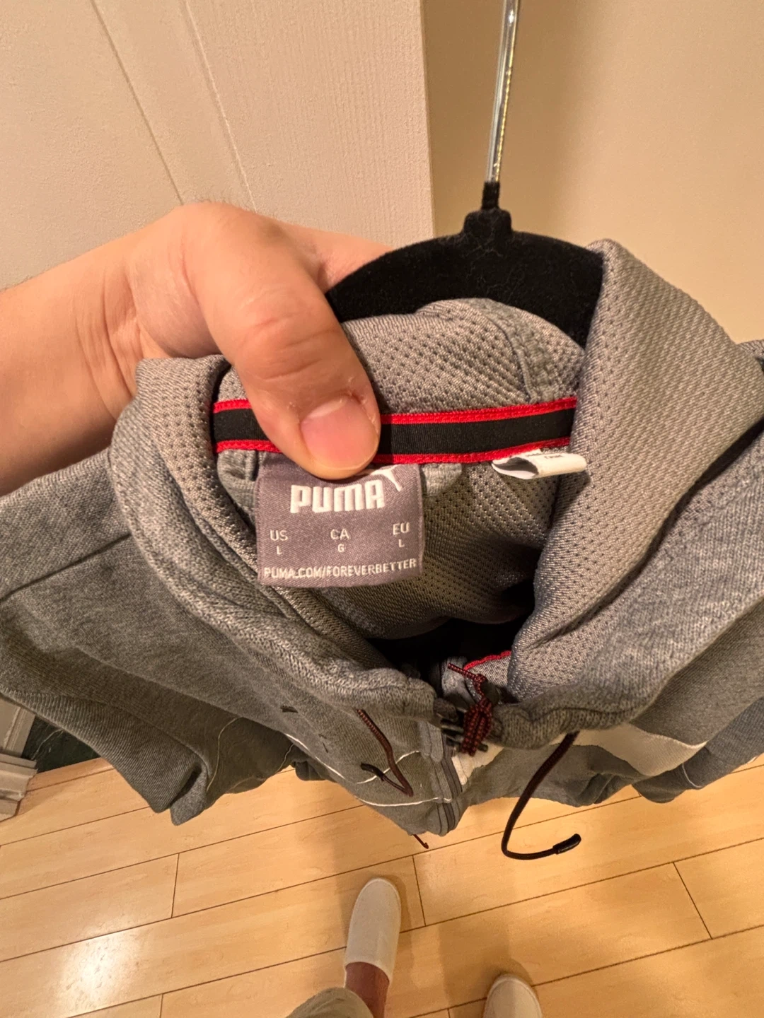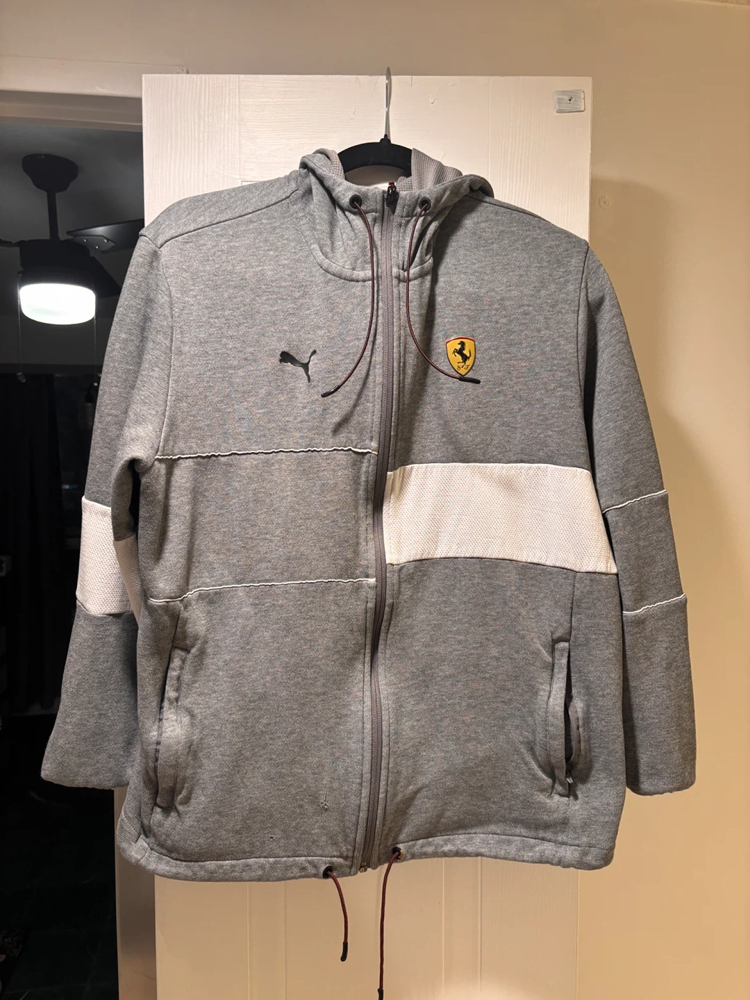 Grey Puma x Scuderia Ferrari full zip-up hoodie. It's a size Large (L). Made with a comfortable fabric blend. Features a hood and front pockets