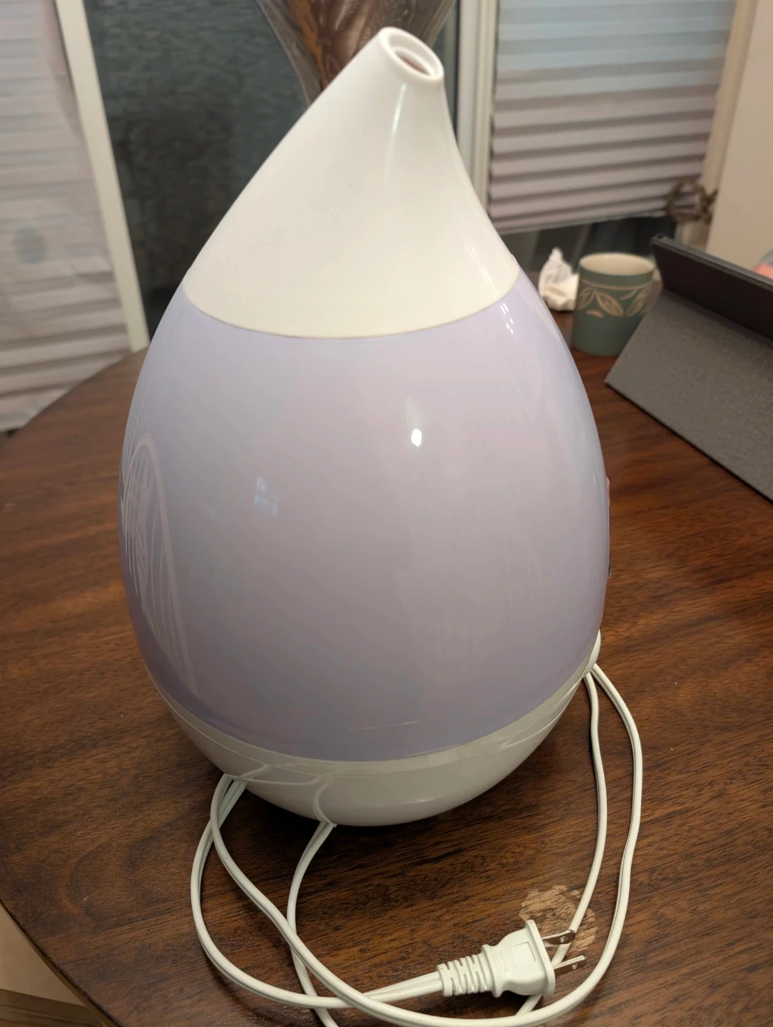 This is a large, teardrop-shaped ultrasonic essential oil diffuser. It has a light purple translucent lower half and a white top. Includes a power cord.
