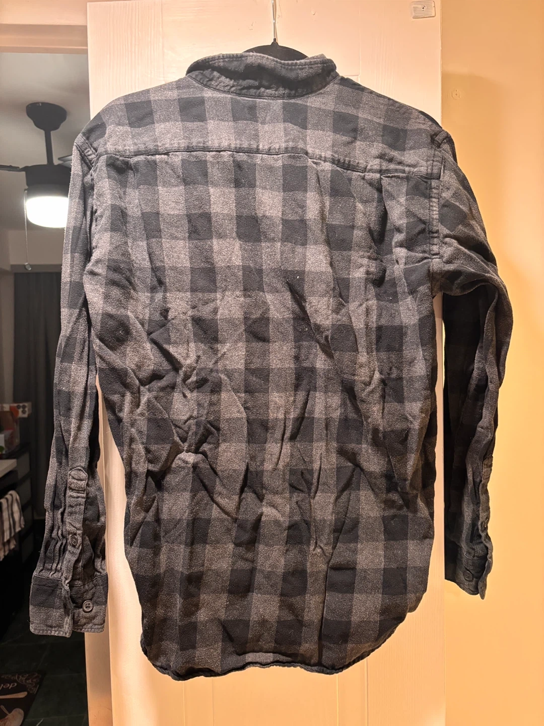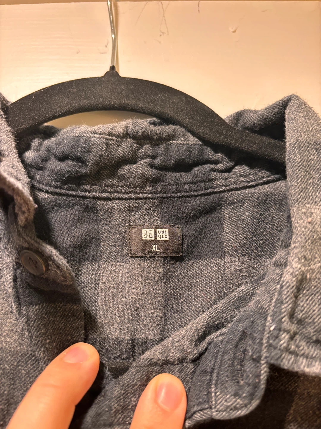 UNIQLO long-sleeved flannel shirt in grey and black plaid. Size XL. It's a classic button-up style with a chest pocket. This shirt's great for layering on cooler days!