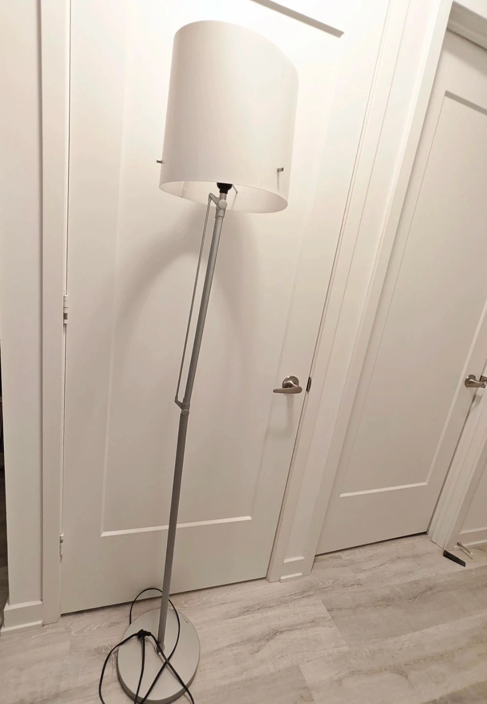 Floor lamp with a silver finish. It has an adjustable arm, so you can direct the light where you need it.