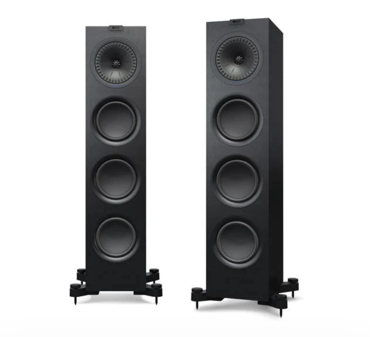 A pair of black Kef floorstanding speakers. They feature a Uni-Q driver array and multiple bass drivers for rich sound. Includes spiked feet for stability. Great for home theatre or music listening!