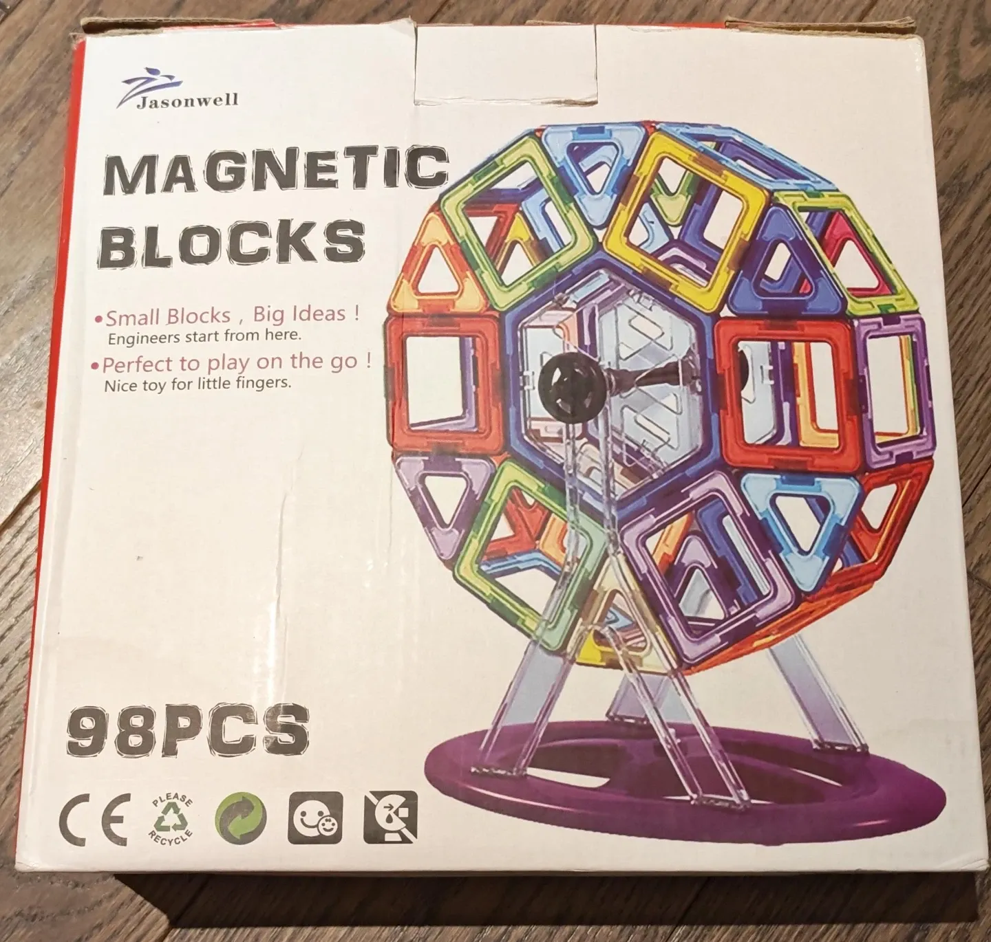 This is a 98-piece set of Jasonwell magnetic blocks. These magnetic tiles are colourful and come in various shapes. They're great for building different structures and models.