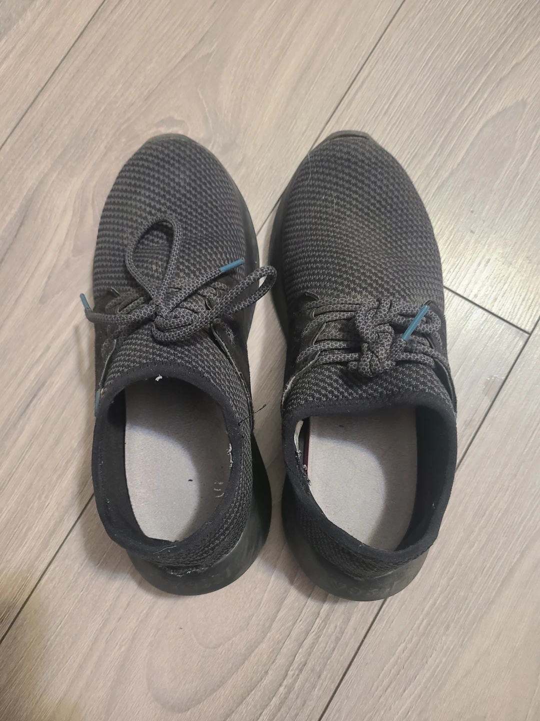 These Vessi running shoes are a size 8. They're black with blue accents on the soles. The uppers are made of a breathable mesh material.