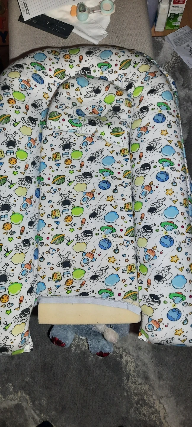 This baby lounger features a fun space-themed print with astronauts, rockets, and planets. It's designed for comfort and support for little ones. Soft, padded material for a cozy feel.