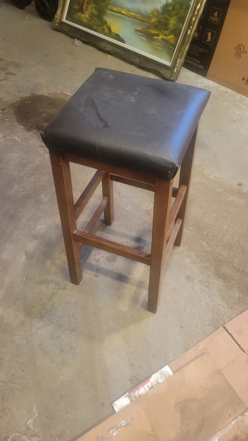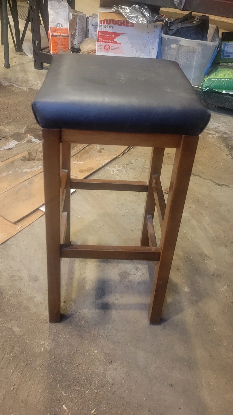 This is a bar stool with a wooden frame and a padded dark seat. It's suitable for a kitchen counter or bar area. The stool provides a comfortable place to sit.