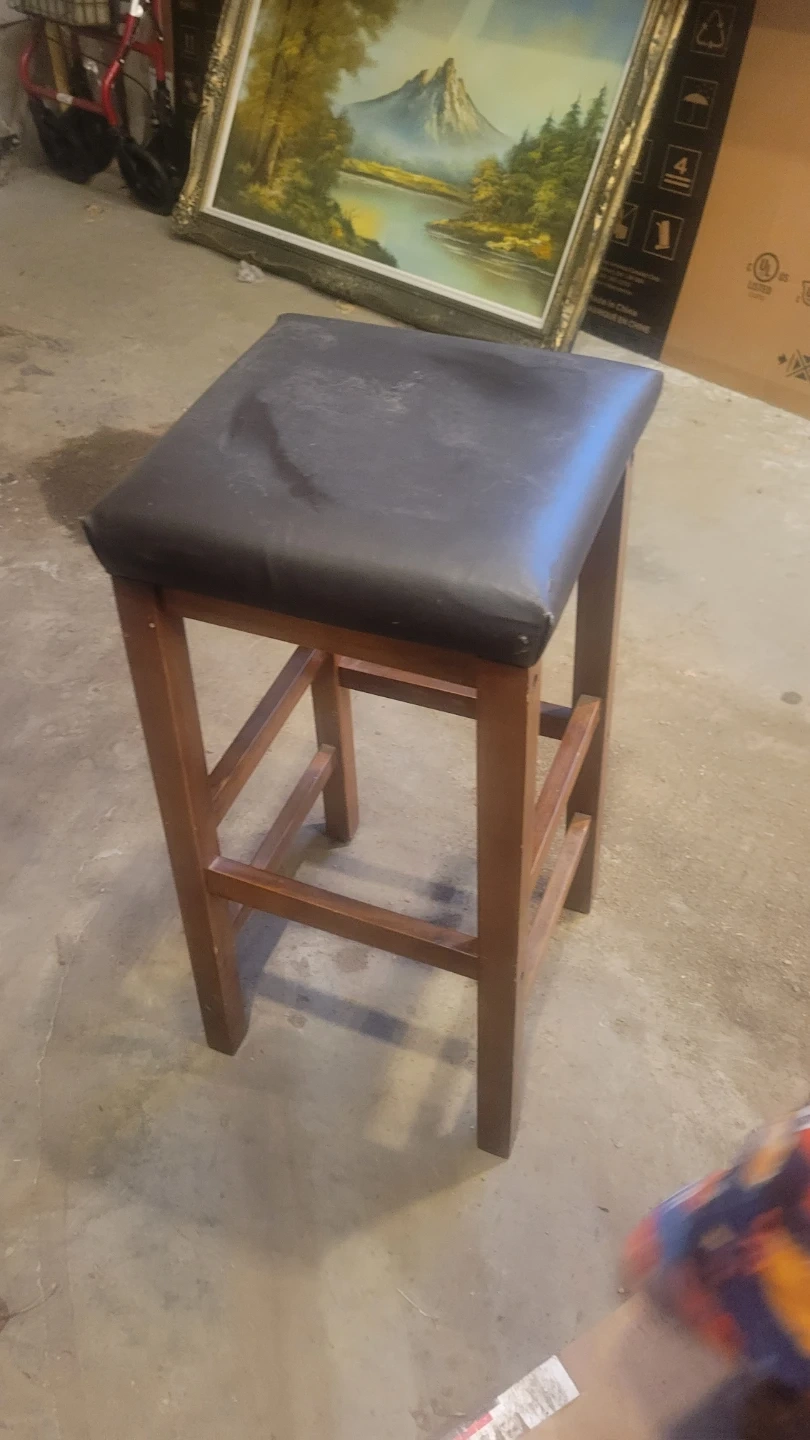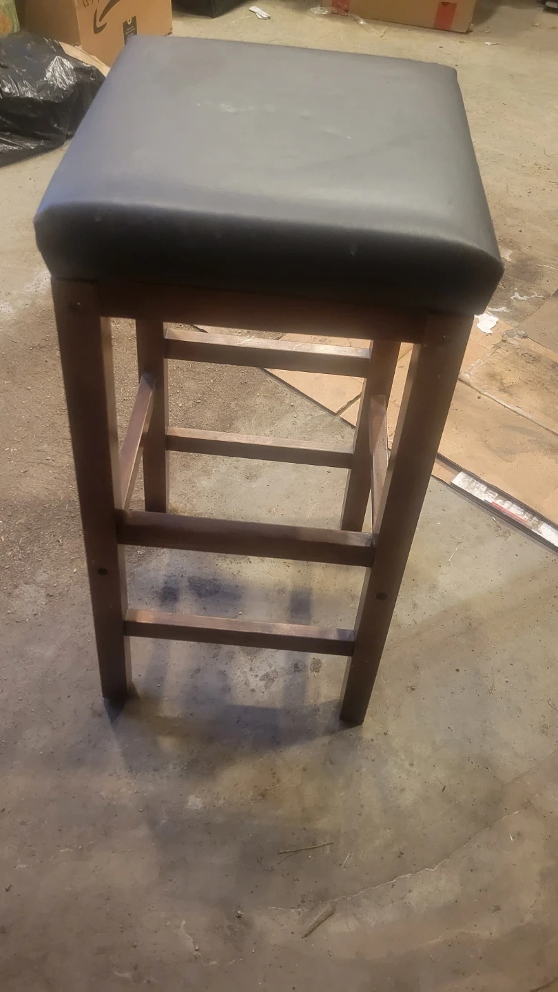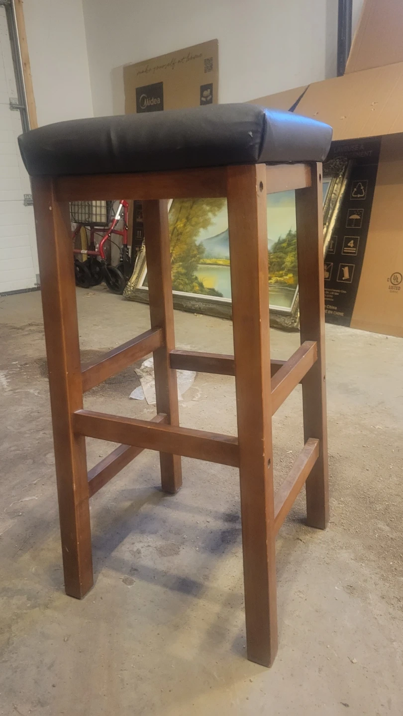 This is a bar stool with a wooden frame and a padded dark seat. It's suitable for a kitchen counter or bar area. The stool provides a comfortable place to sit.