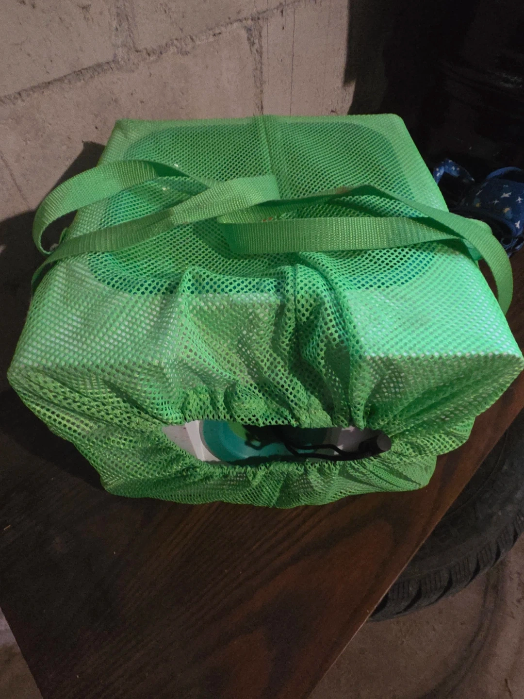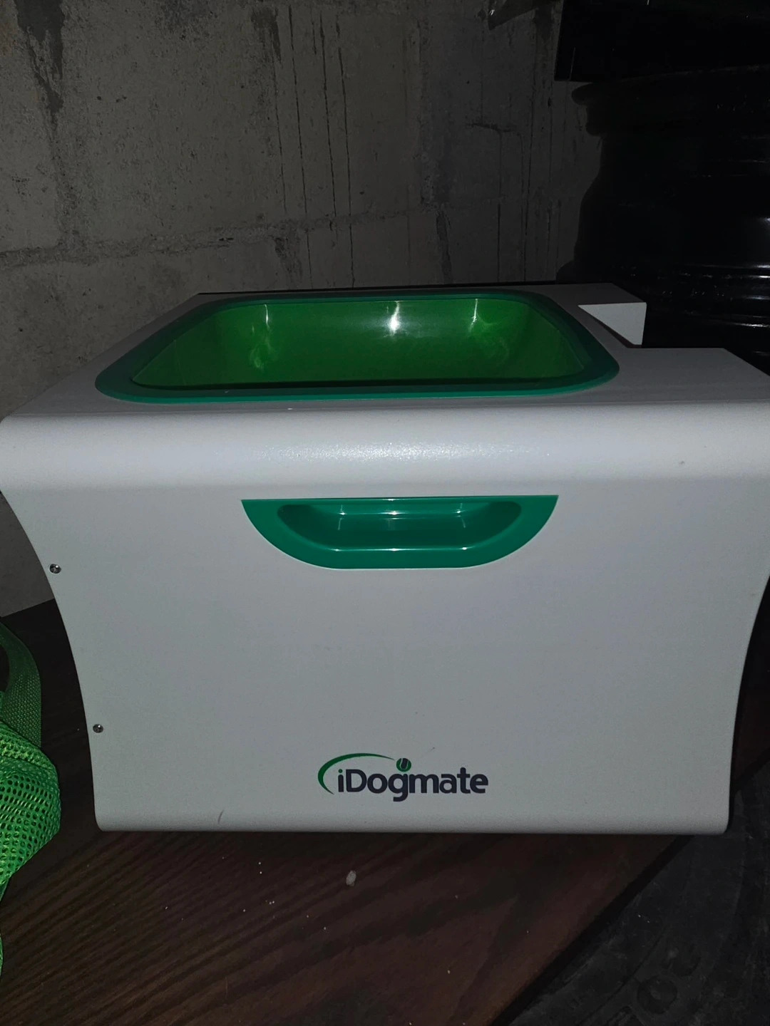 This is the iDogmate automatic dog ball launcher. It comes with a green mesh bag for easy transport. Perfect for keeping your furry friend entertained indoors or out!