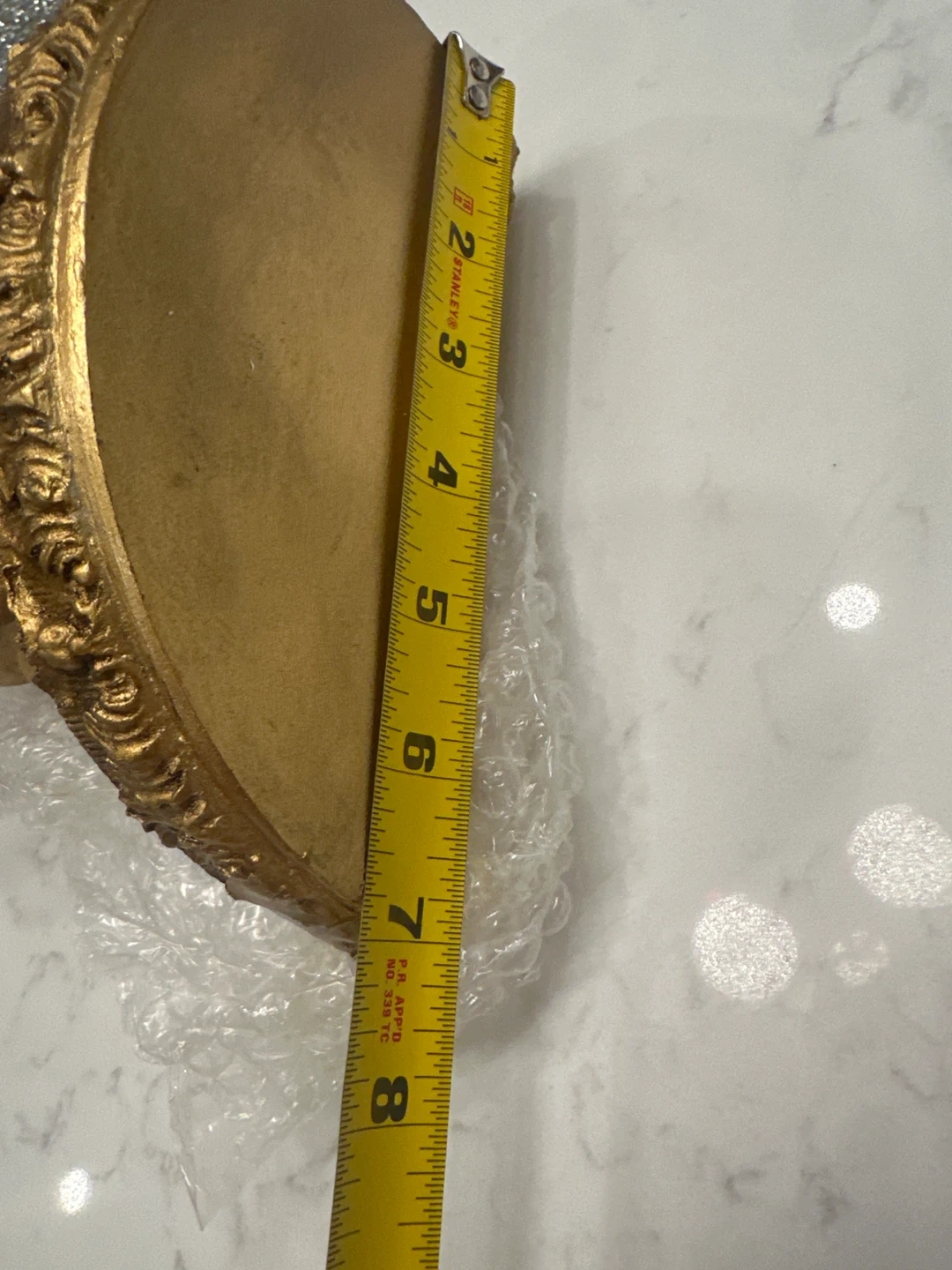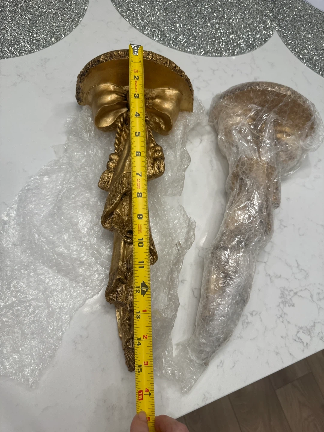 This is a pair of decorative wall shelves, finished in a gold colour with ornate detailing and a tassel-like design. Each shelf measures approximately 12 inches long and 6 inches deep. They're perfect for displaying small decorative items.
